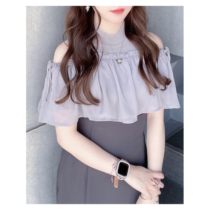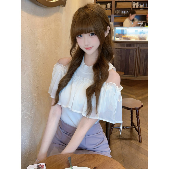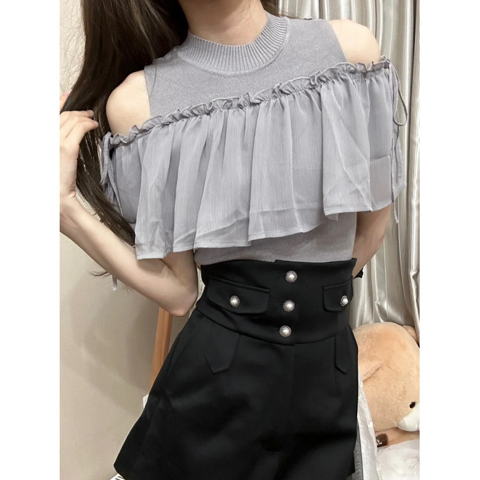 小泡芙日系春款清楚系女裝時尚荷葉邊露肩修身圓領百搭針織襯上衣