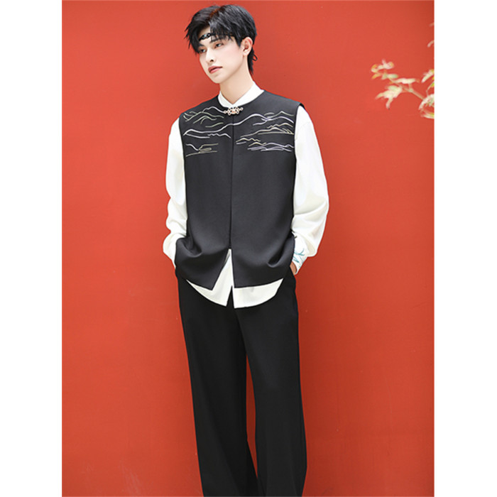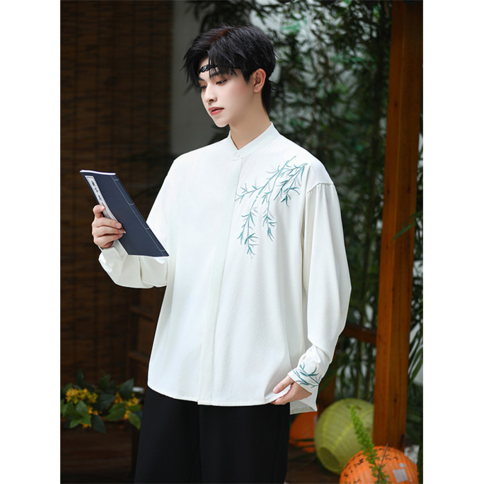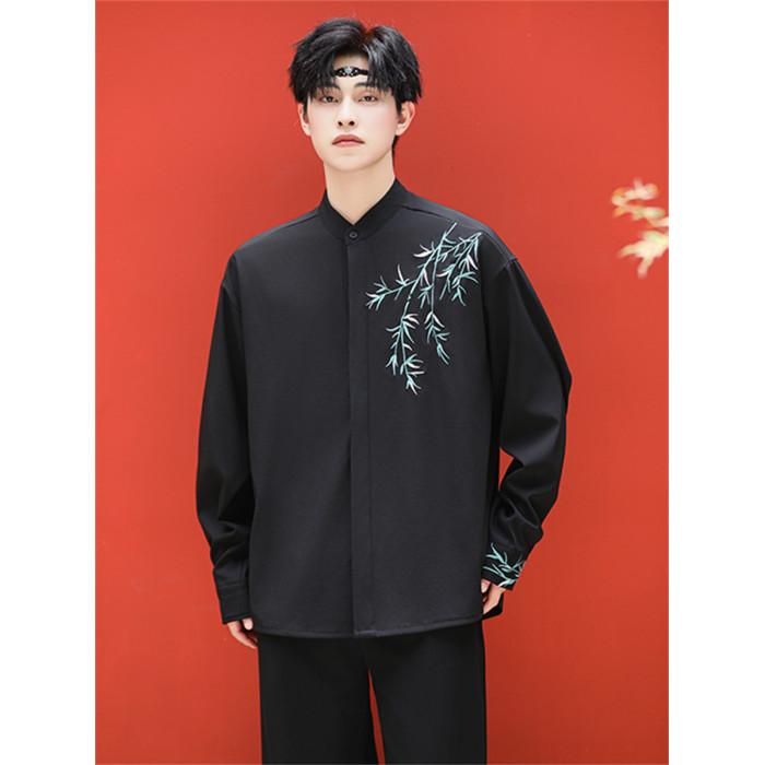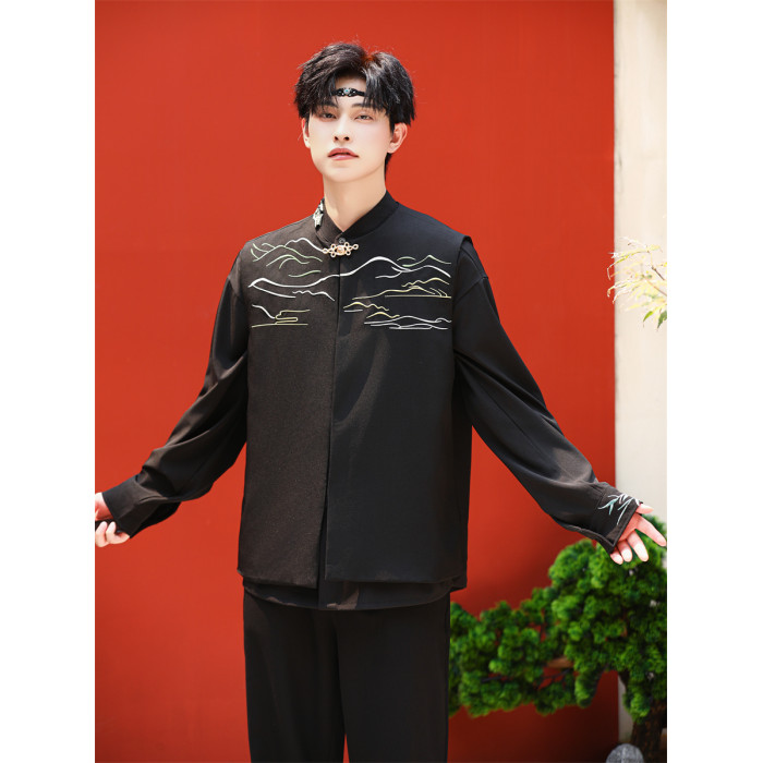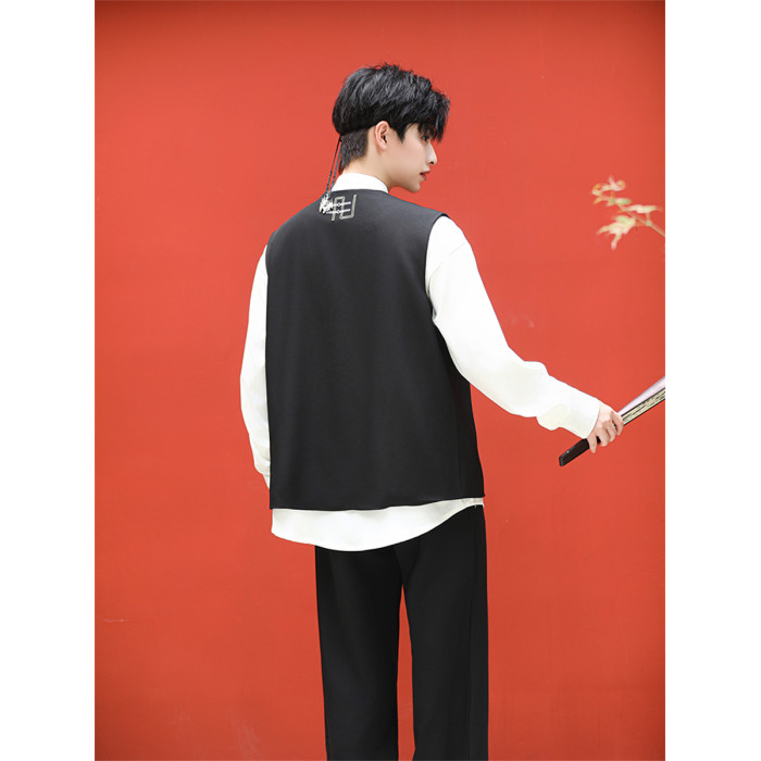 新中式男士民國風襯衫立領刺綉襯衣大碼古風上衣中學生馬甲套裝秋