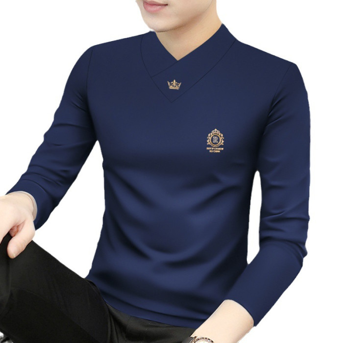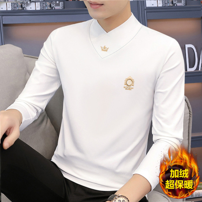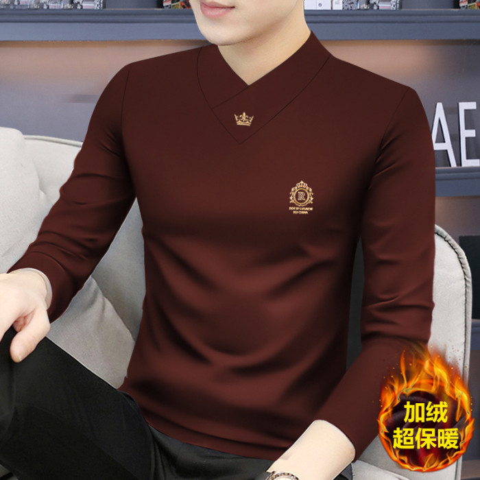 秋冬新款男士長袖t恤加絨加厚內搭保暖打底衫v領體恤上衣服潮男裝