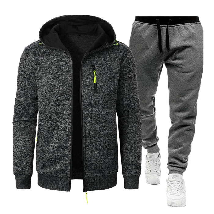 新款男士運動健身休閒提花衛衣連帽外套針織開衫套裝款