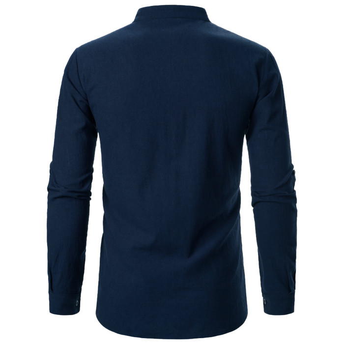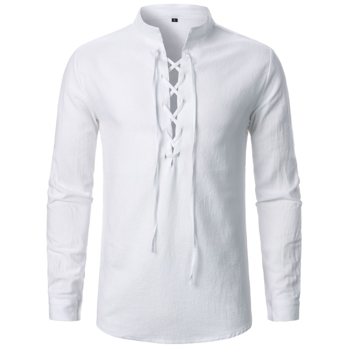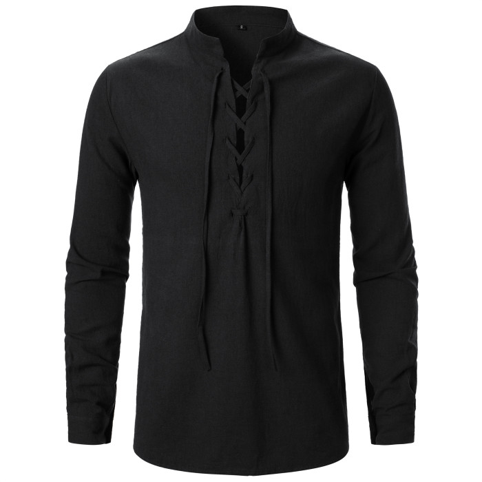 夏季新款男士短袖T恤棉麻系帶領子亨利衫嬉皮休閒長袖襯衫