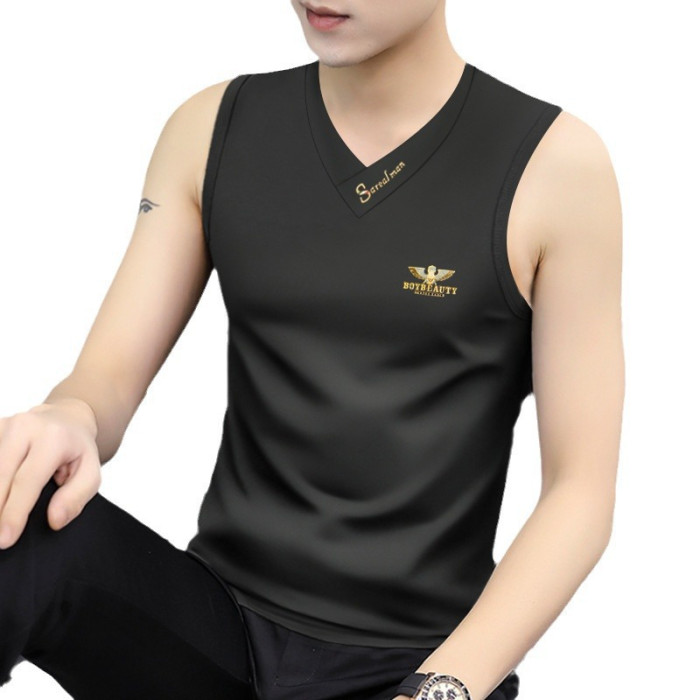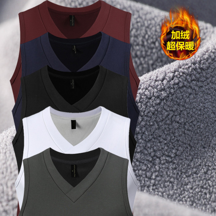 秋冬季新款男士寬肩加絨背心無袖t恤加厚坎肩老頭保暖上衣打底衫