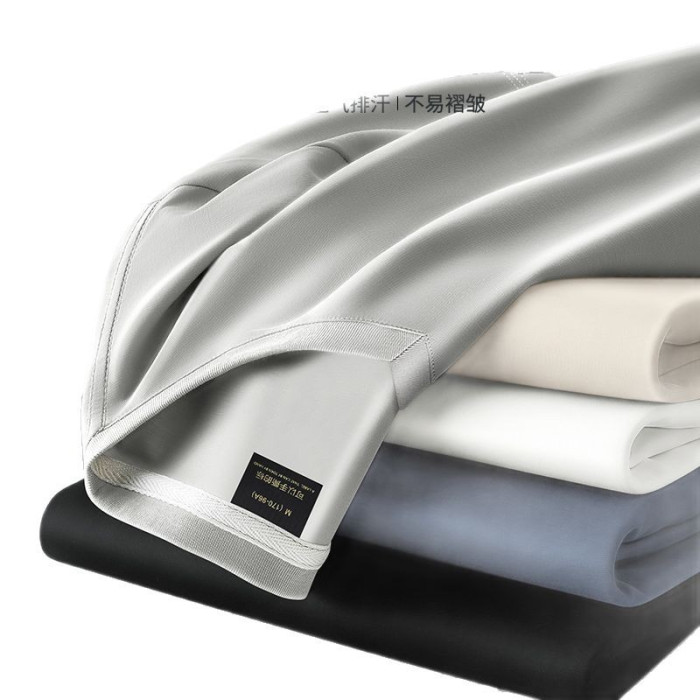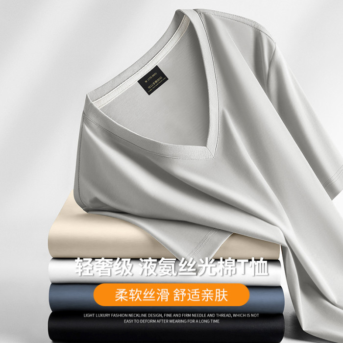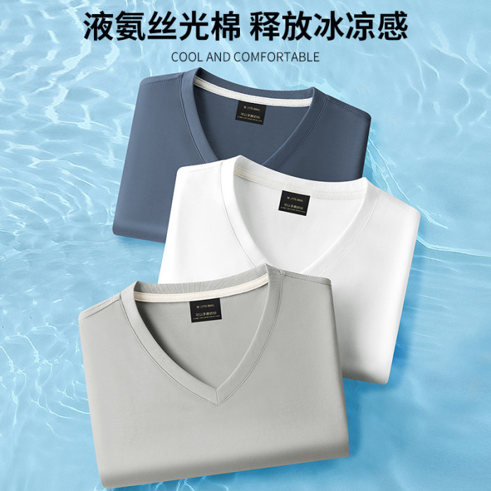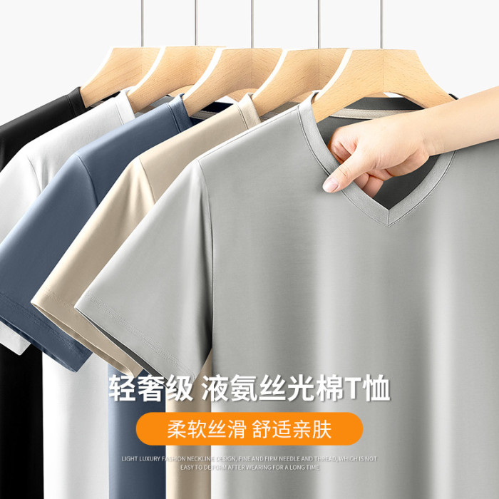 夏季新款男士V液氨絲光棉短袖T恤修身半袖透氣涼感上衣潮寬松