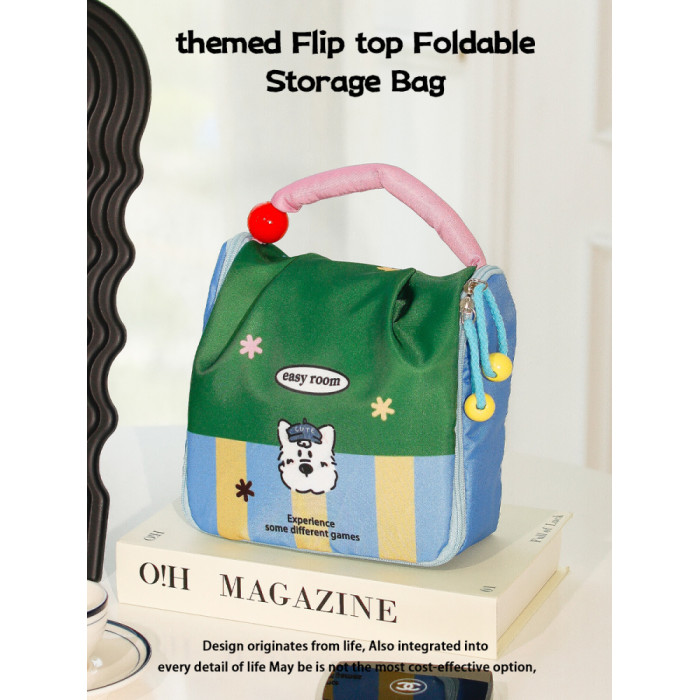 藍黃粗條紋HuHu小狗棉底牛津繙蓋小化妝收納包