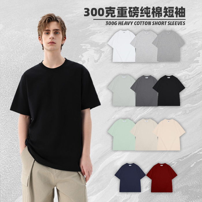 夏季男裝300克重磅純色純棉圓領T恤寬松版型短袖雙紗潮牌T打底衫