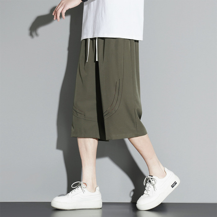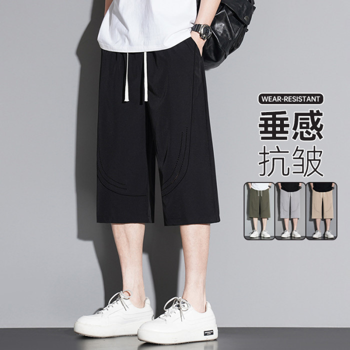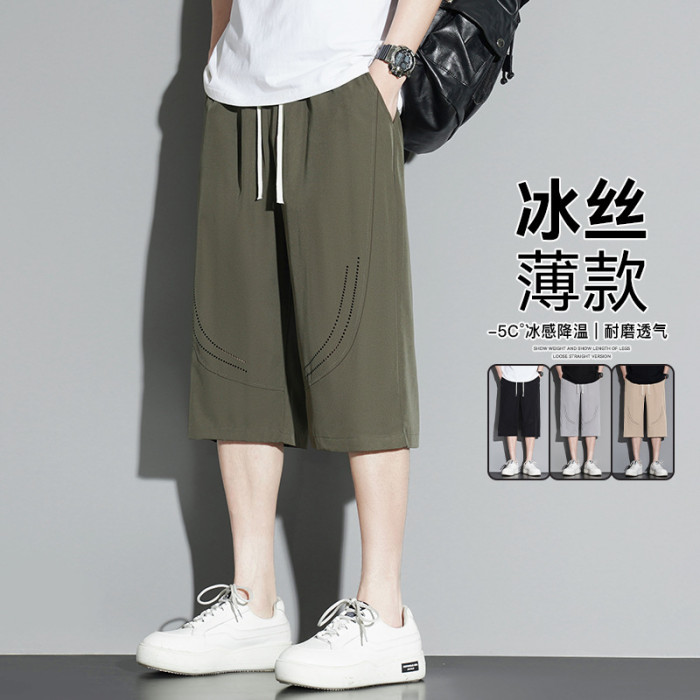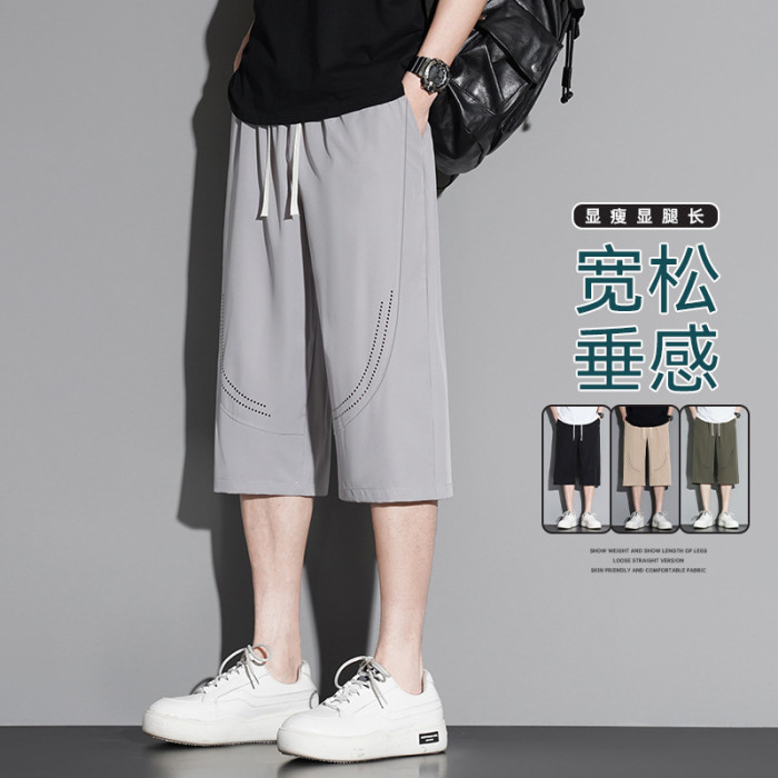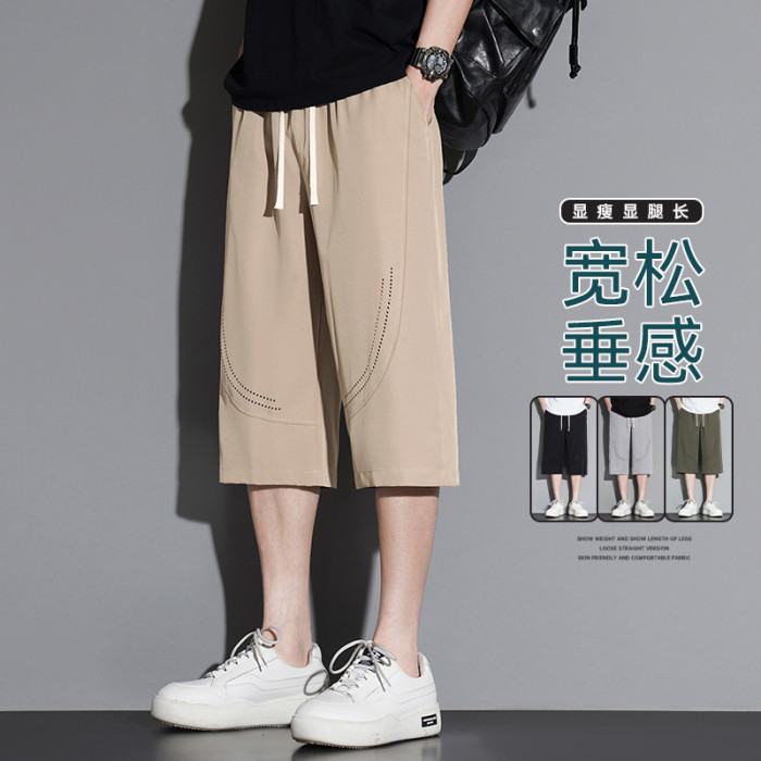 2025夏季新款冰絲彈力七分褲男港風寬松沖孔休閒運動短褲潮牌五分