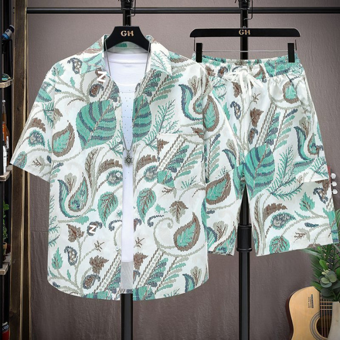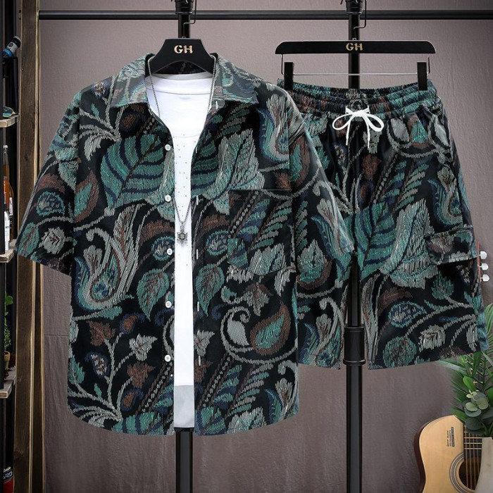 2025新款休閒套裝男夏季短袖襯衫青年兩件套學生短褲襯衣大碼一套