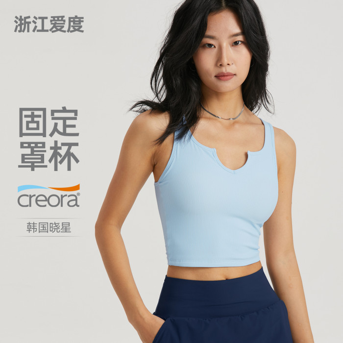 FPS中強度透氣固定杯運動內衣女夏季羅紋瑜伽文胸V領跑步健身背心