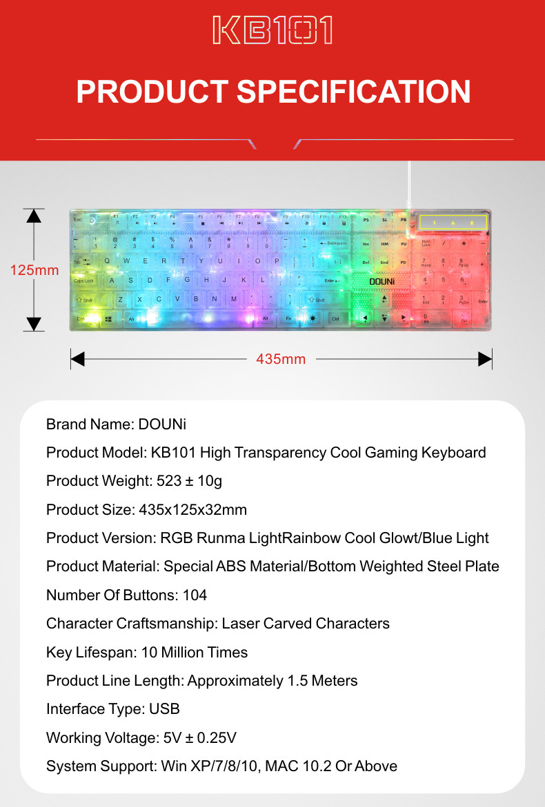 鬭尼KB101高質透明炫酷有線鍵盤 一箱是30個,外箱尺寸:52.5*46.5*31cm 重量:15.3kg