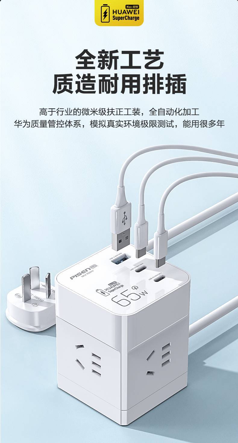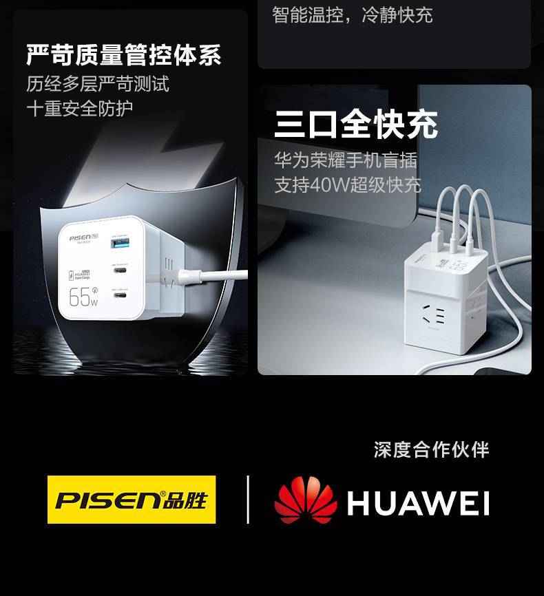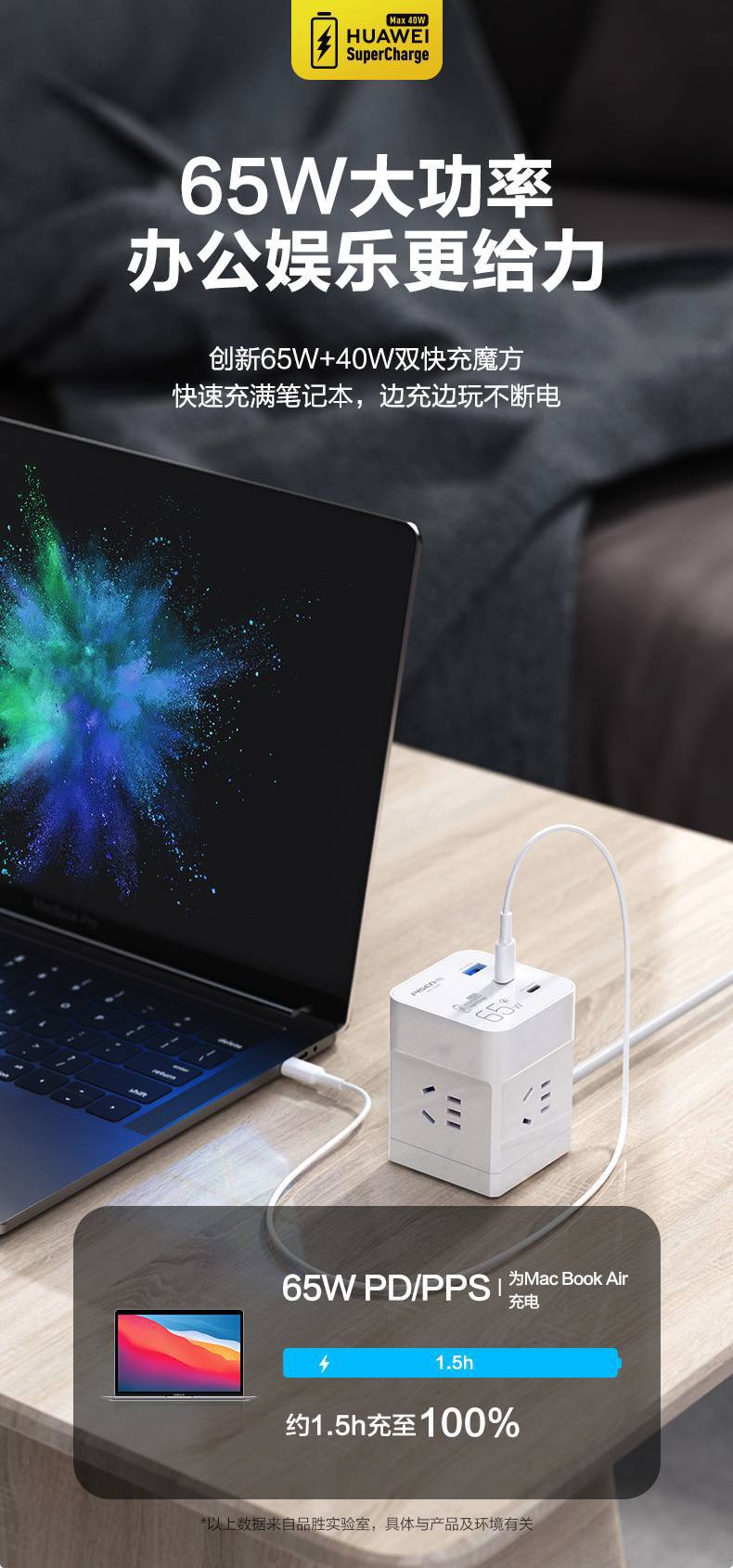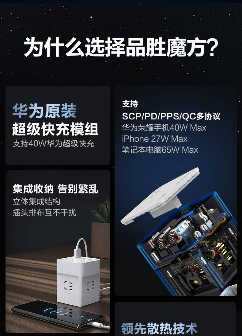 品勝3口65W智能魔方多功能4孔拖線板USB插座適用華爲超級快充40W