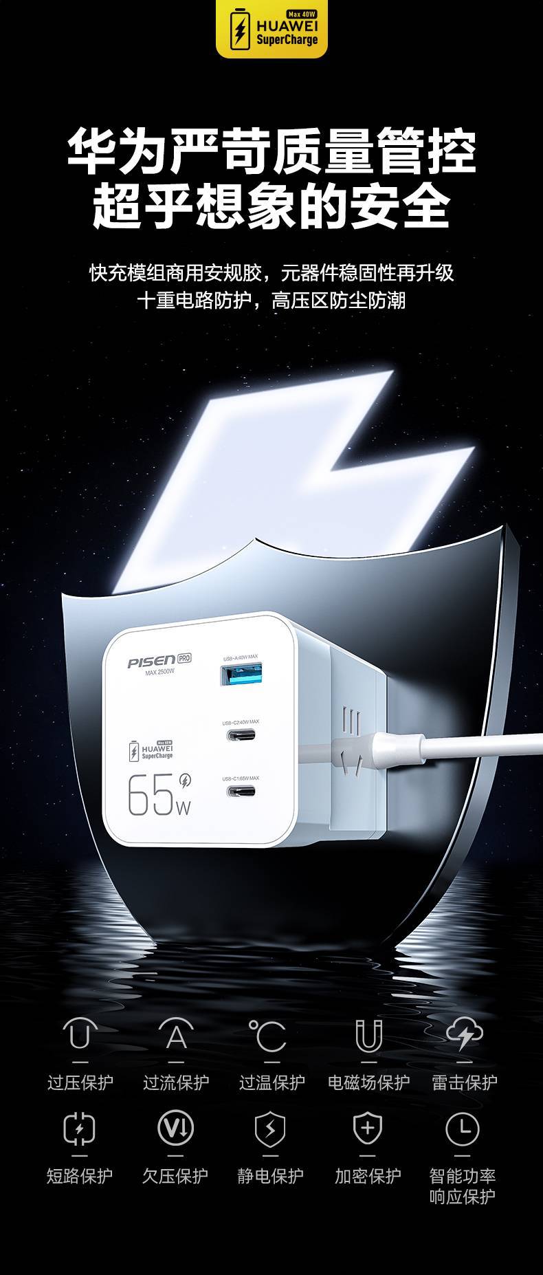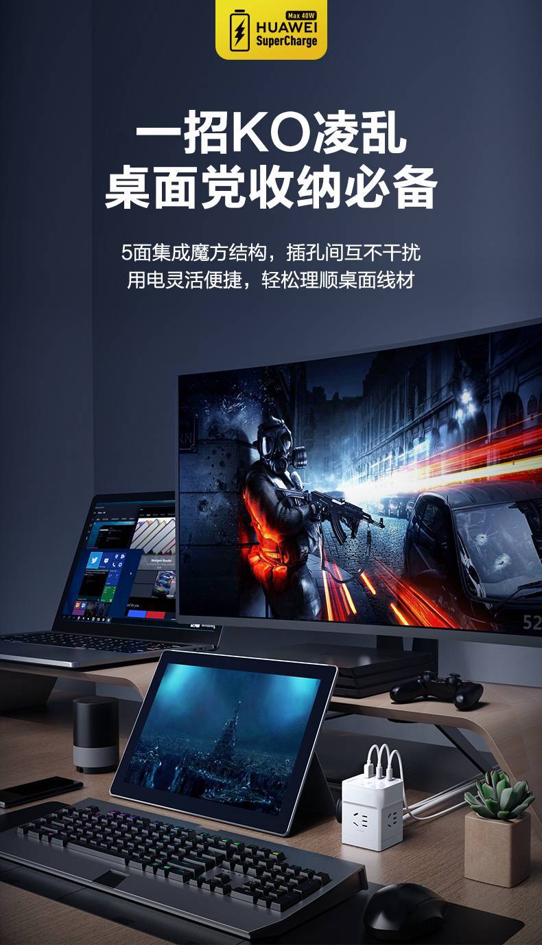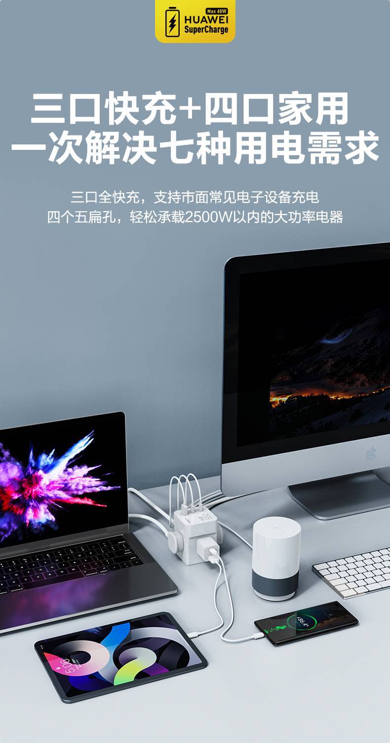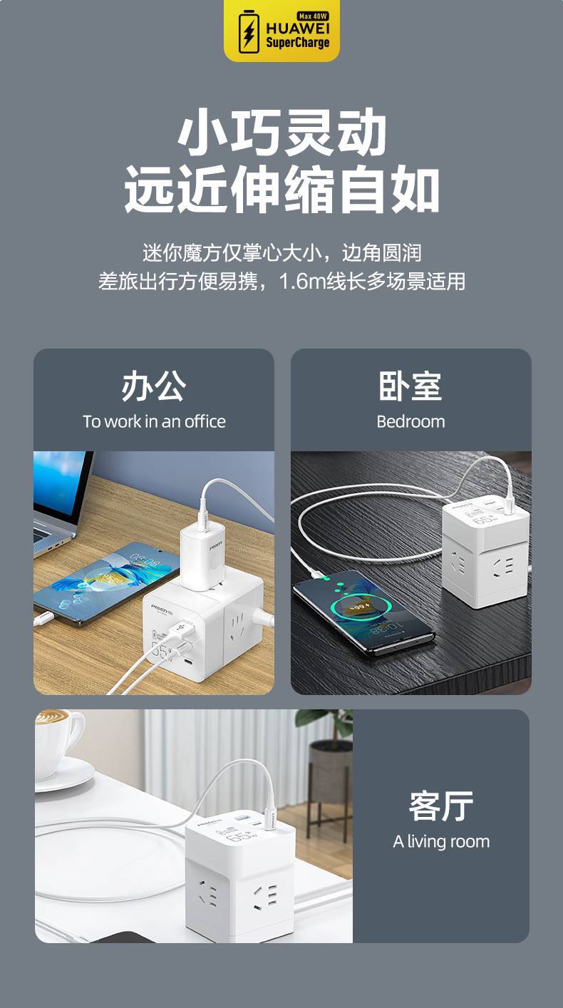 品勝3口65W智能魔方多功能4孔拖線板USB插座適用華爲超級快充40W