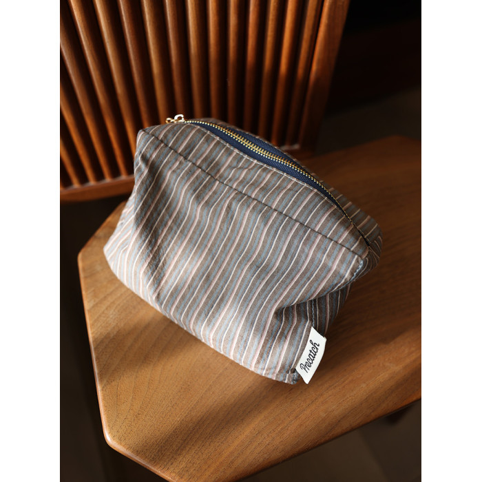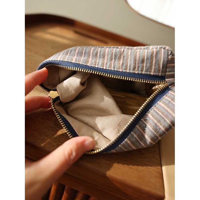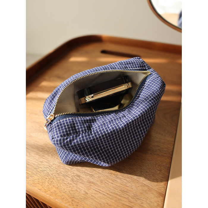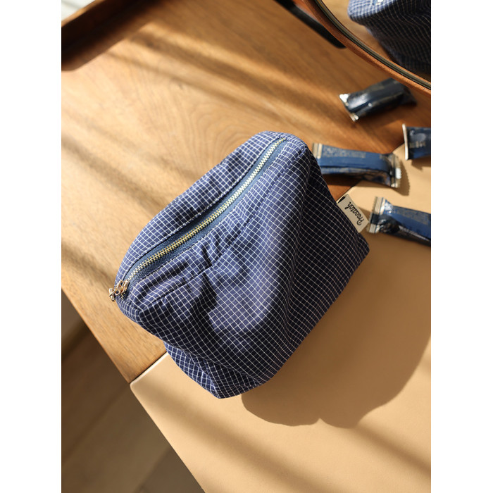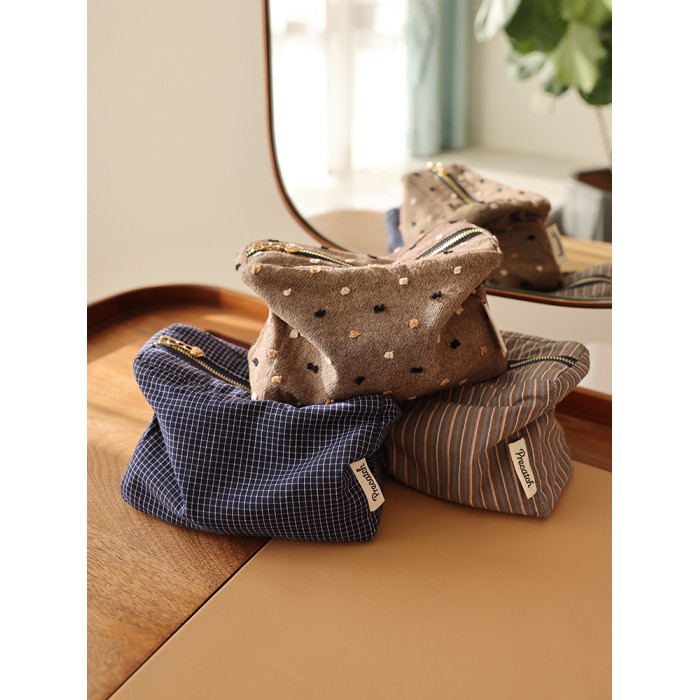 格子條紋布藝化妝包方形立體拉鍊收納包旅行可攜式手拿包內膽包日系