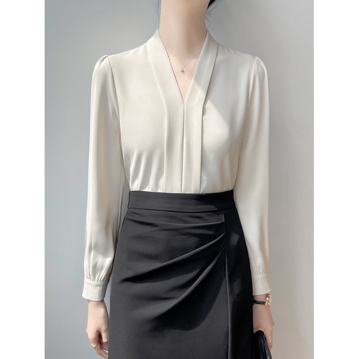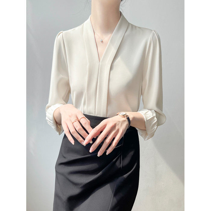 韓帛雅2025年春秋新款長袖V領襯衫女通勤職業面試襯衣高級感上衣