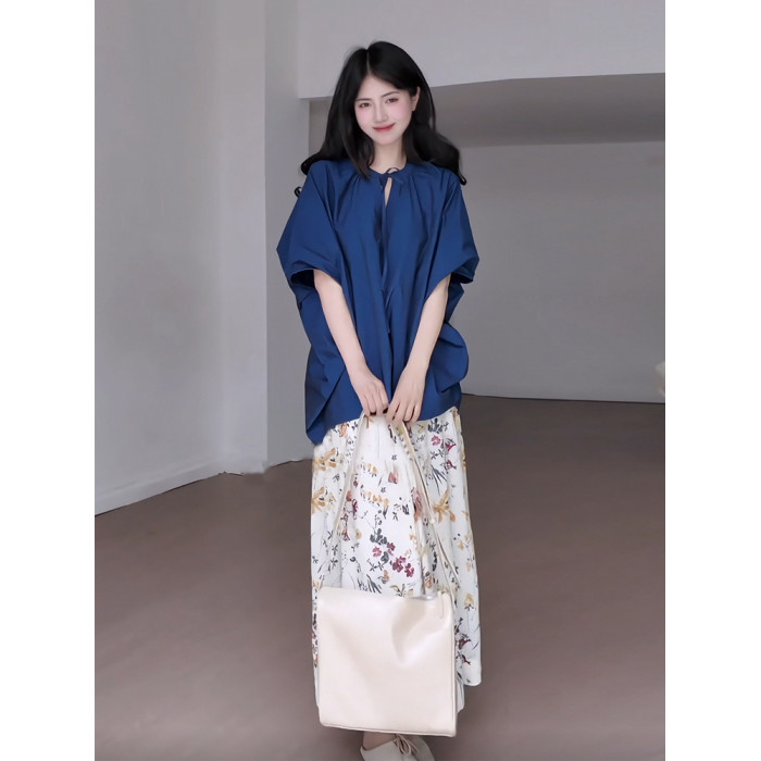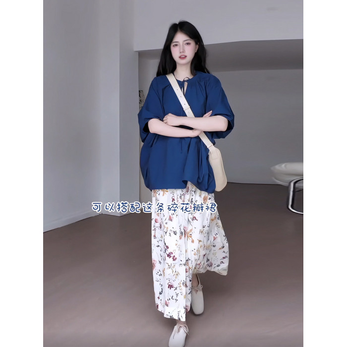 日系復古寬松蝙蝠袖系帶襯衫女夏季氛圍感碎花百褶半身裙兩件套裝