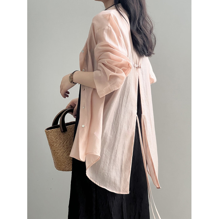 後背盤釦天絲襯衫女夏薄紗防曬珠光透視露背開叉上衣吊帶外搭開衫
