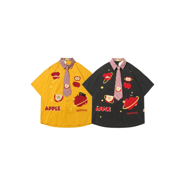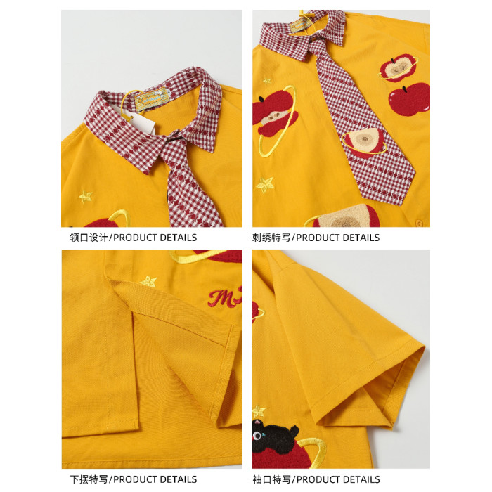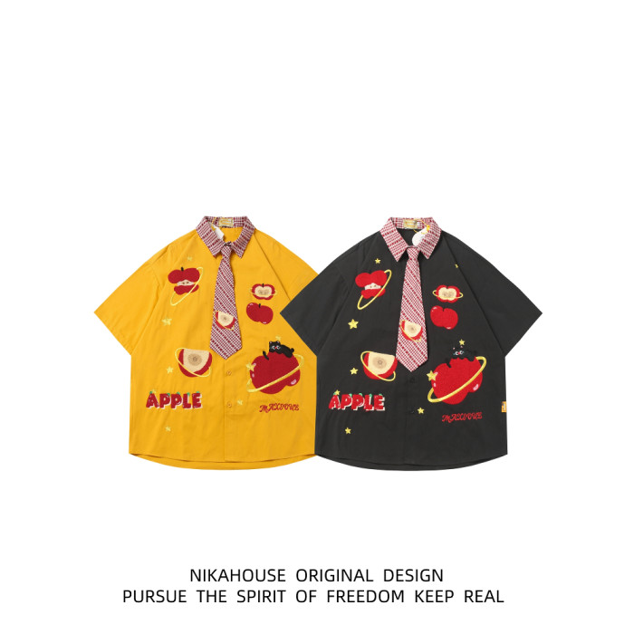 NIKAHOUSE可愛蘋果Apple刺綉領帶短袖襯衫女潮牌學院風寬松襯衣