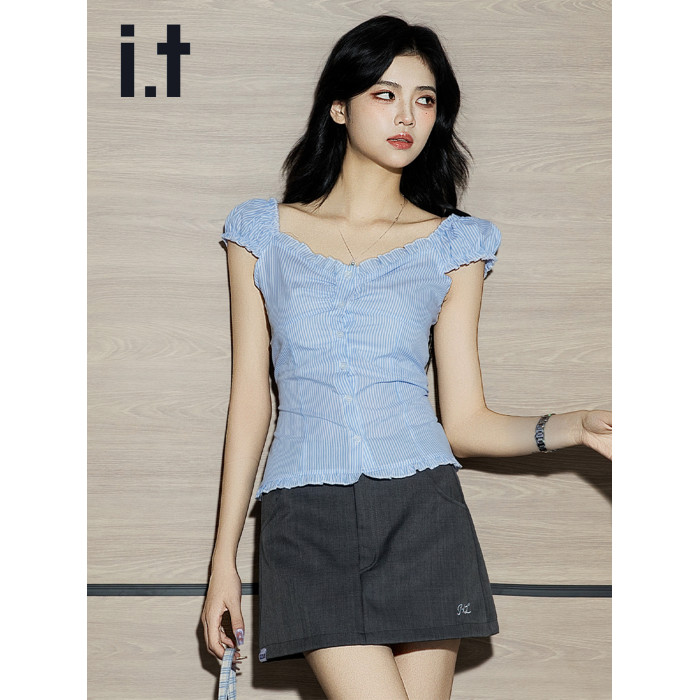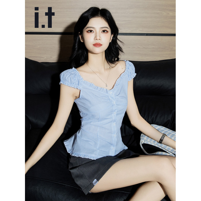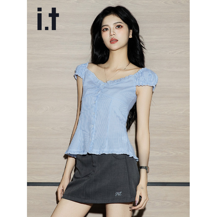 it izzue純欲v領襯衫女春夏新款修身松緊收腰短袖小衫一字肩上衣
