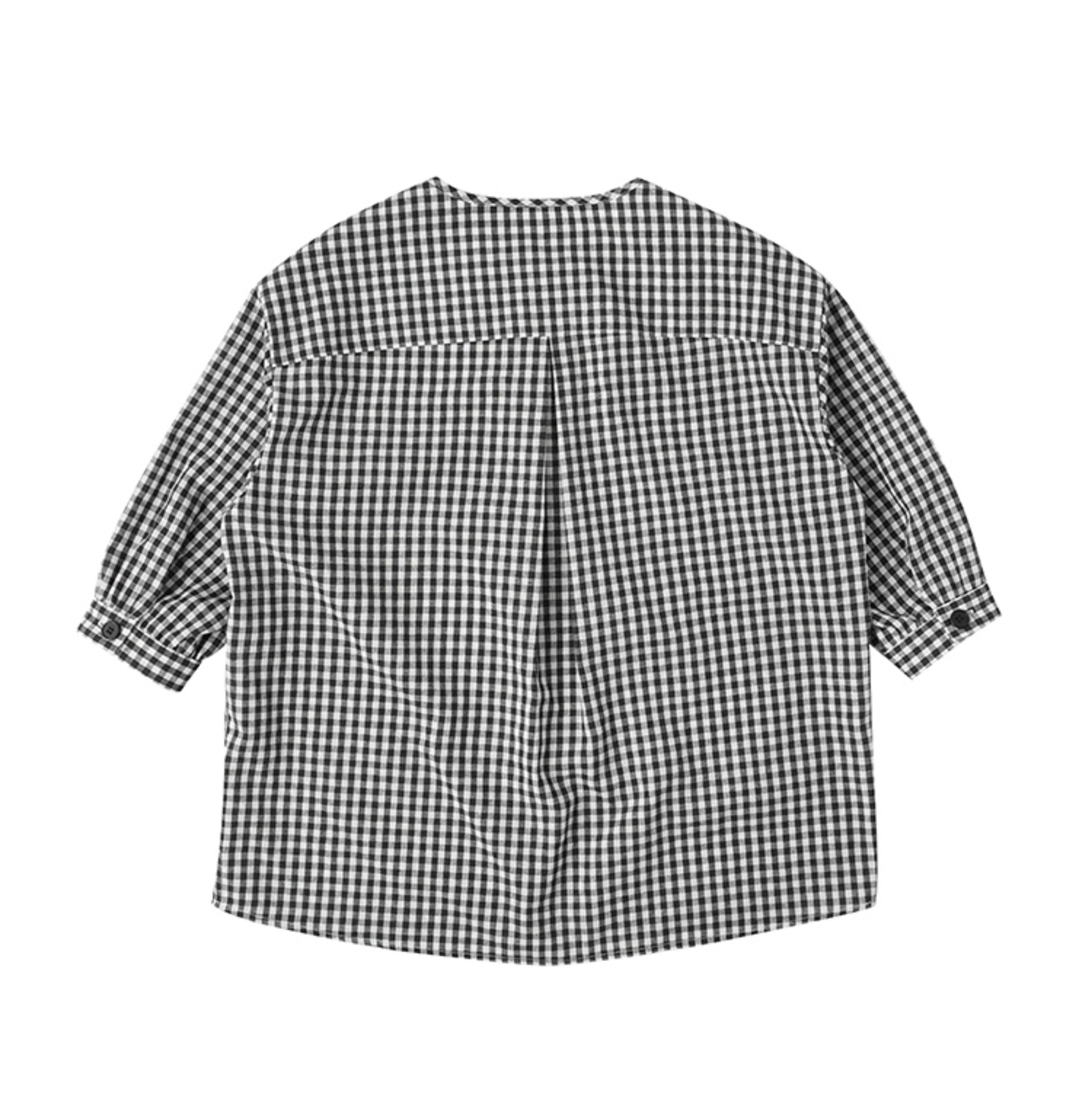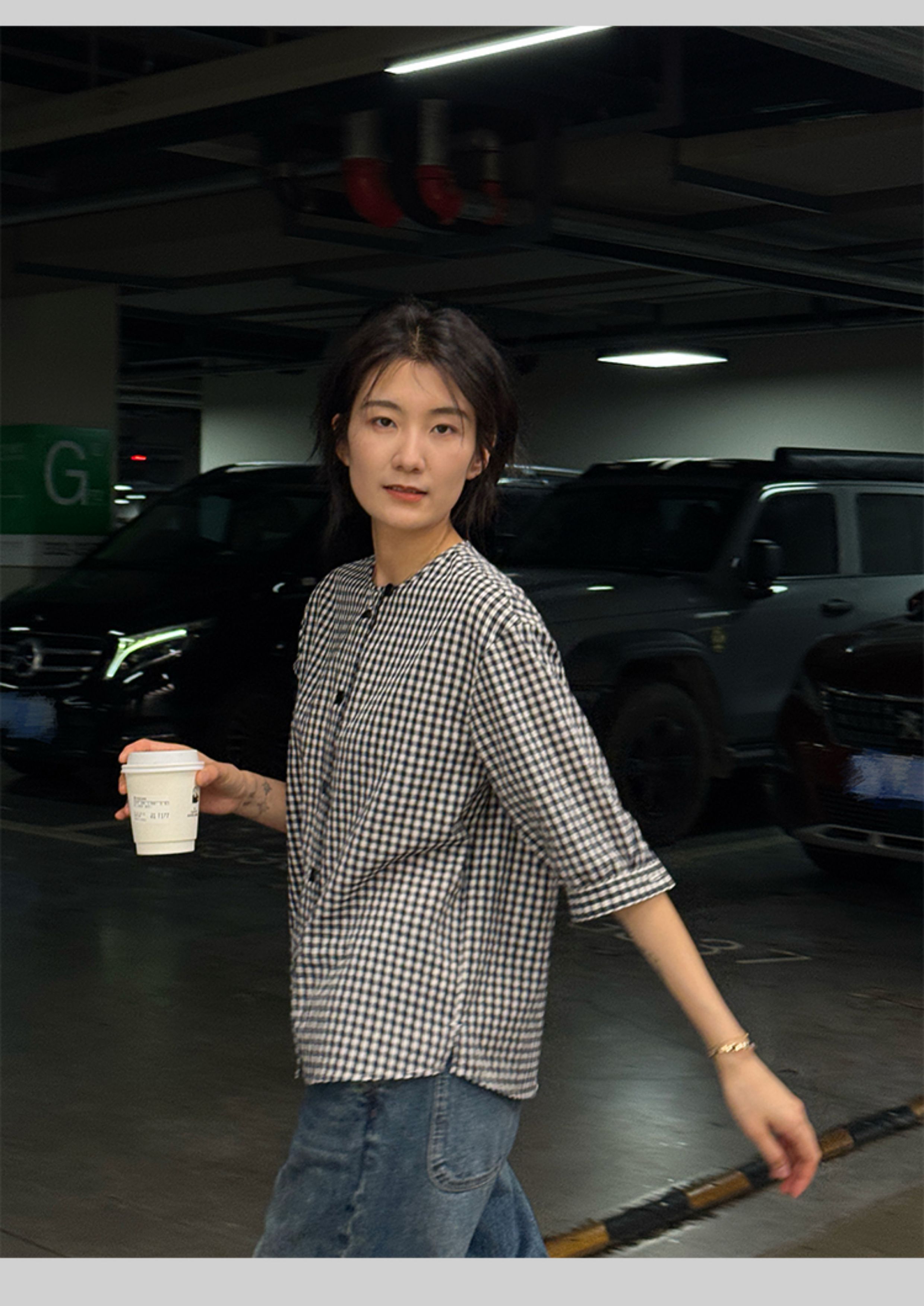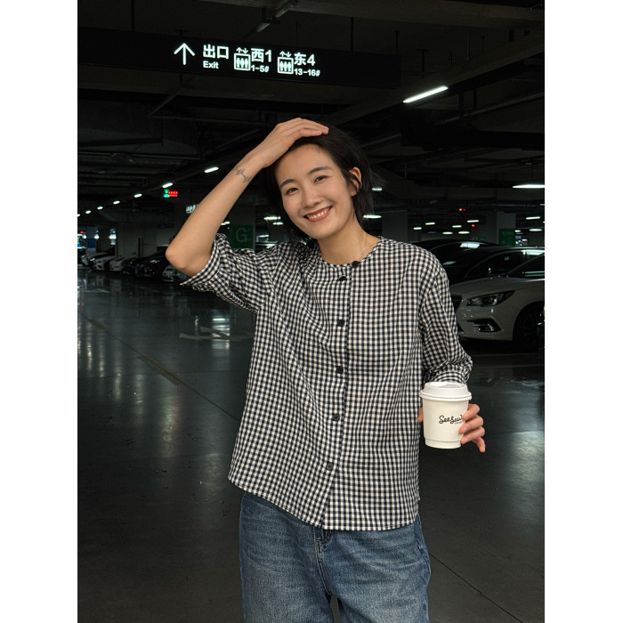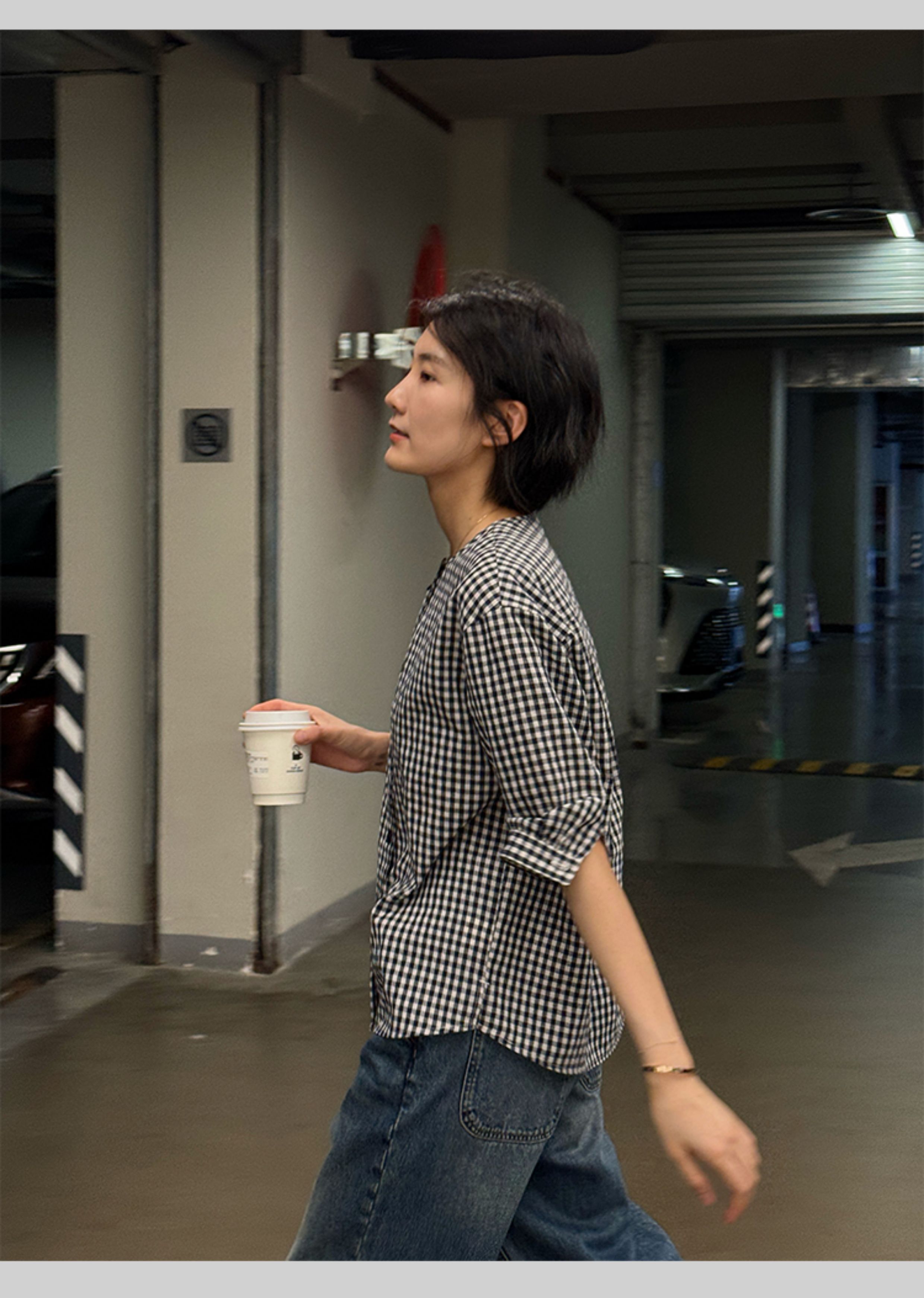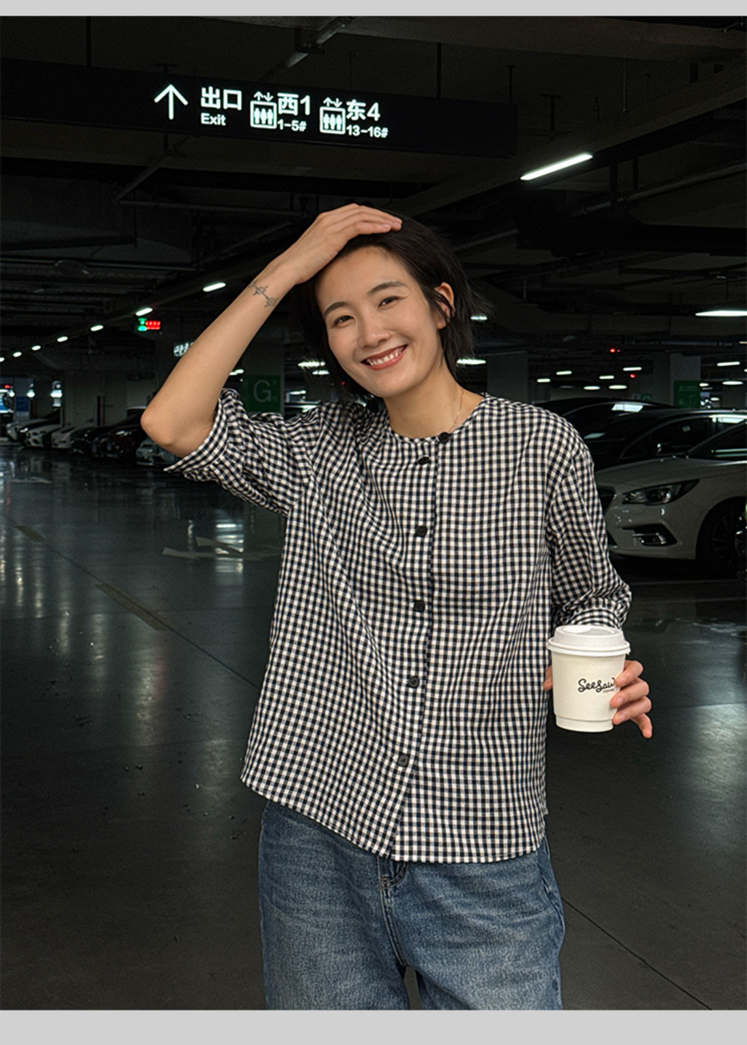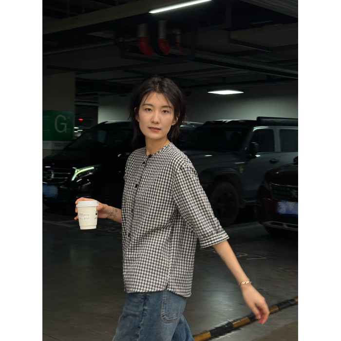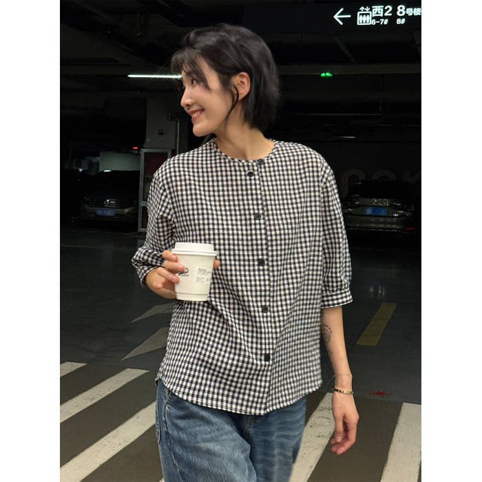 浪清格子襯衫女早秋2025新款寬松五分袖上衣女獨特超好看別致小衫