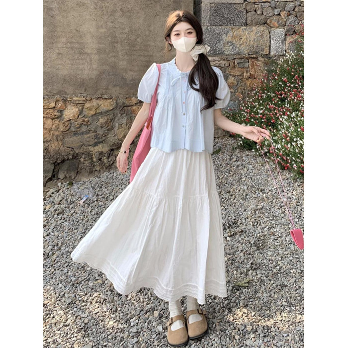藍色上衣+白色半身裙