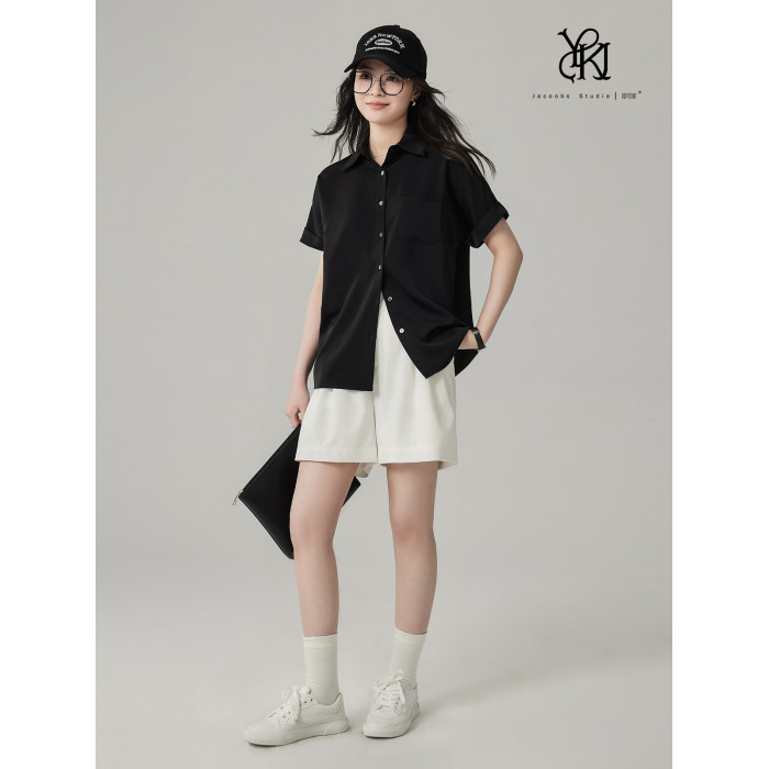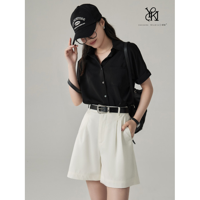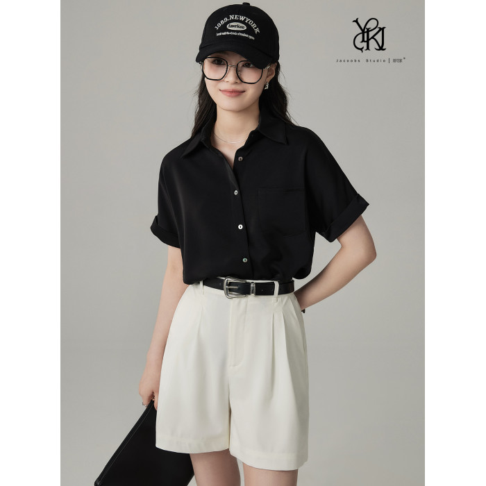 婭可家黑色緞面短袖襯衫女夏季職業通勤氣質垂感不易皺休閒襯衣女