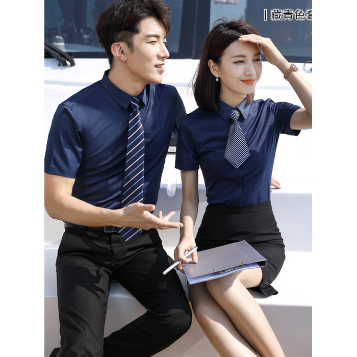 羅矇男女同款白色短袖襯衣彈力竹纖免燙職業套裝女襯衫工作服正裝
