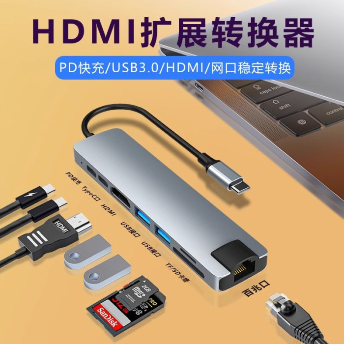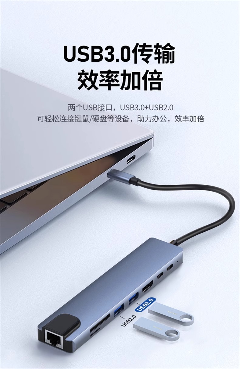 暢銷款【8合1】USB3.0*2+Typec口+SD/TF卡+HDMI+PD100W+百兆