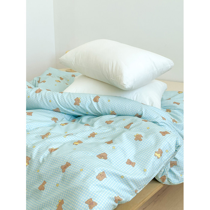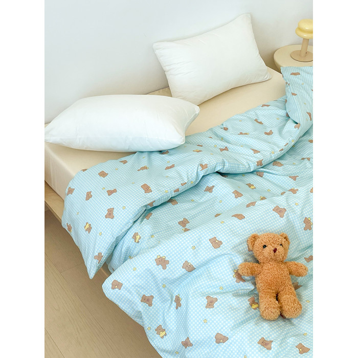 啵啵小熊 奶油系格子小熊全棉卡通被套被芯罩學生床單件ins可愛藍