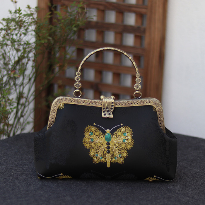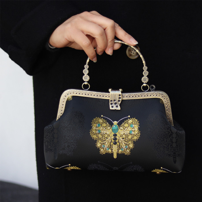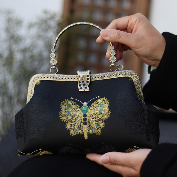 2025新款新中式宋錦提花面料高檔真絲口金包旗袍手提斜背百搭女包