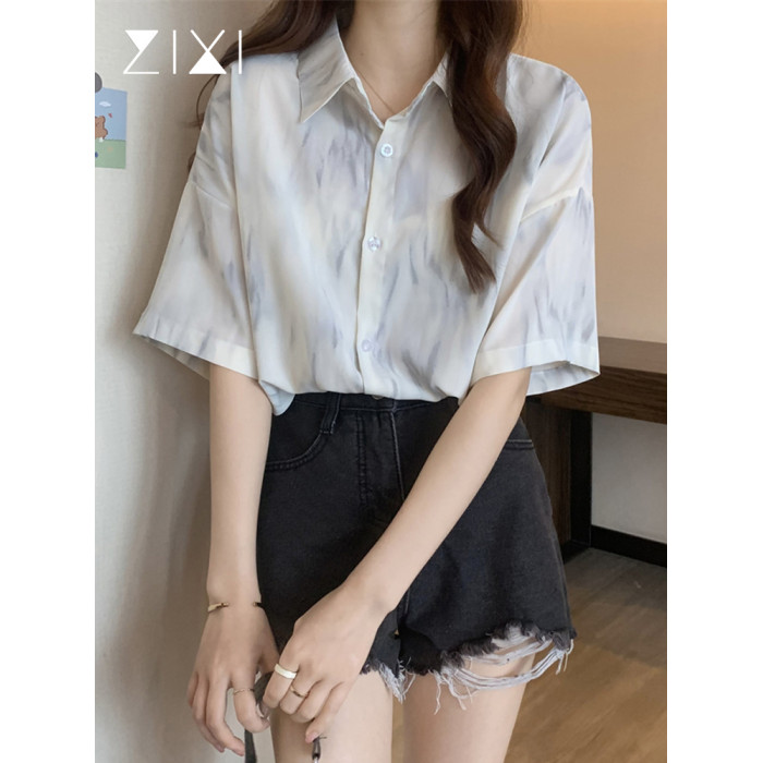 白色襯衫短袖2025復古港風紥染水墨印花襯衣設計感小衆上衣女夏季