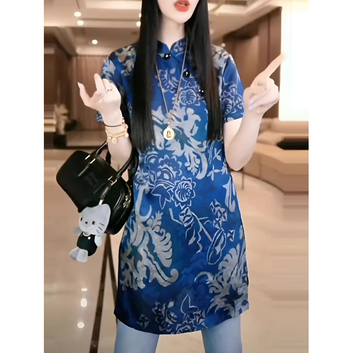 藍色國風印花短袖旗袍襯衫女士夏季斜襟復古時尚小衫遮肉顯瘦上衣