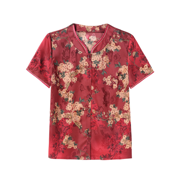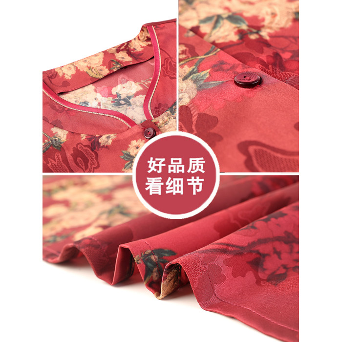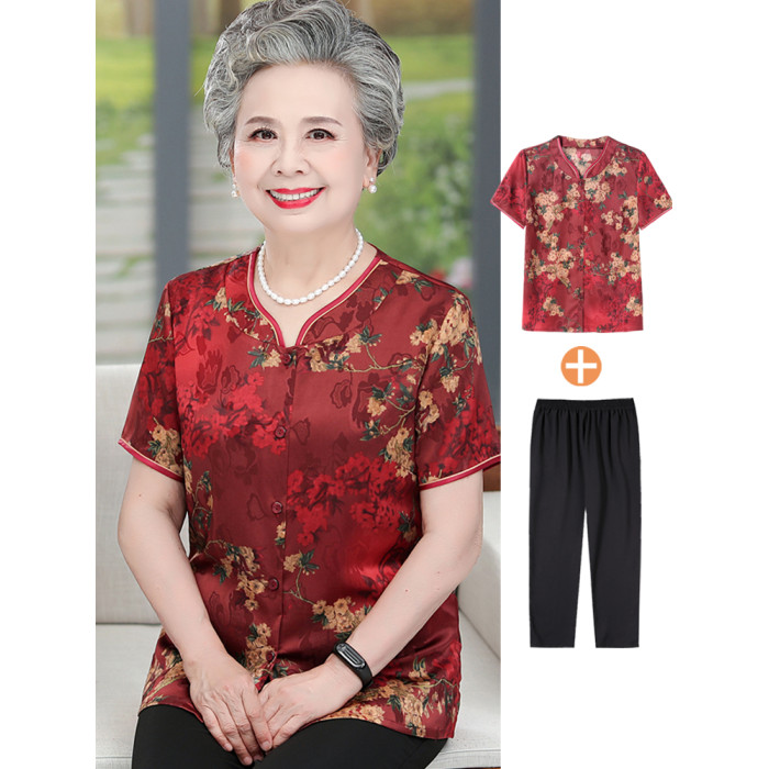 老年人夏裝女真絲襯衫60嵗70媽媽太太喜慶短袖小個子婆婆奶奶套裝