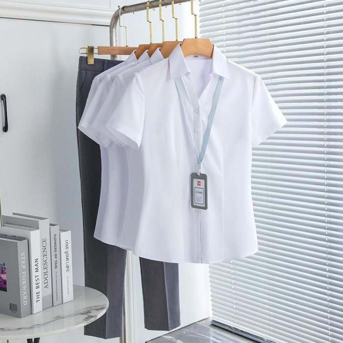 v領白色襯衫女夏季正裝棉布職業套裝辦公行政修身短袖襯衣工作服