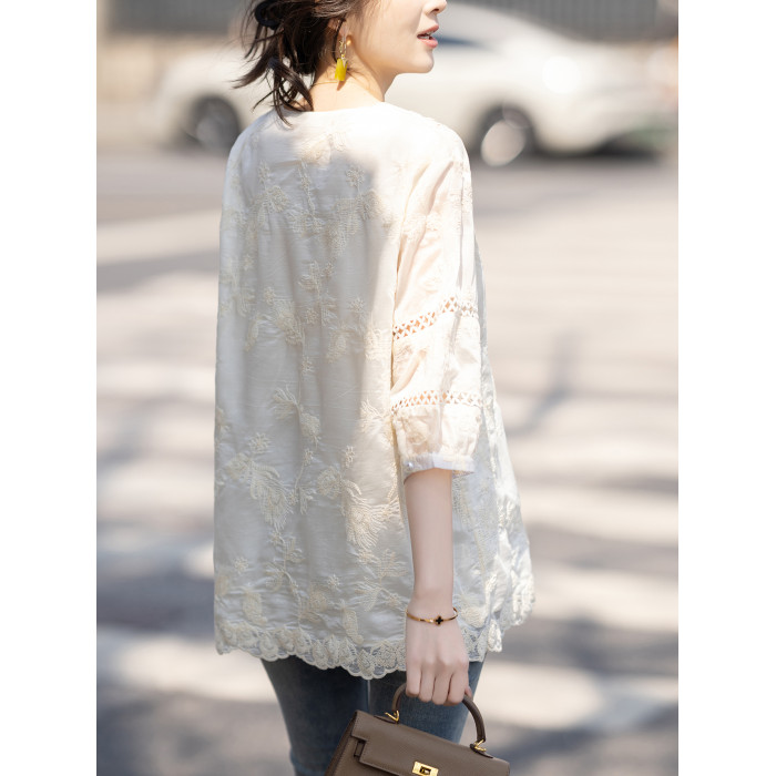 九月墨陌夏季設計感重工拼接v領鏤空襯衫大碼氣質百搭小衫上衣女