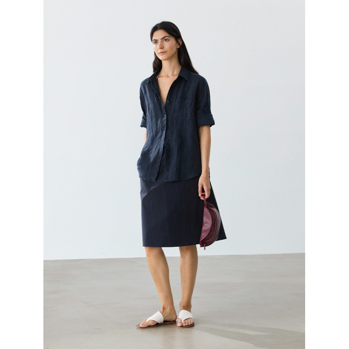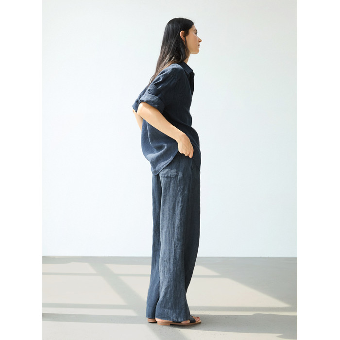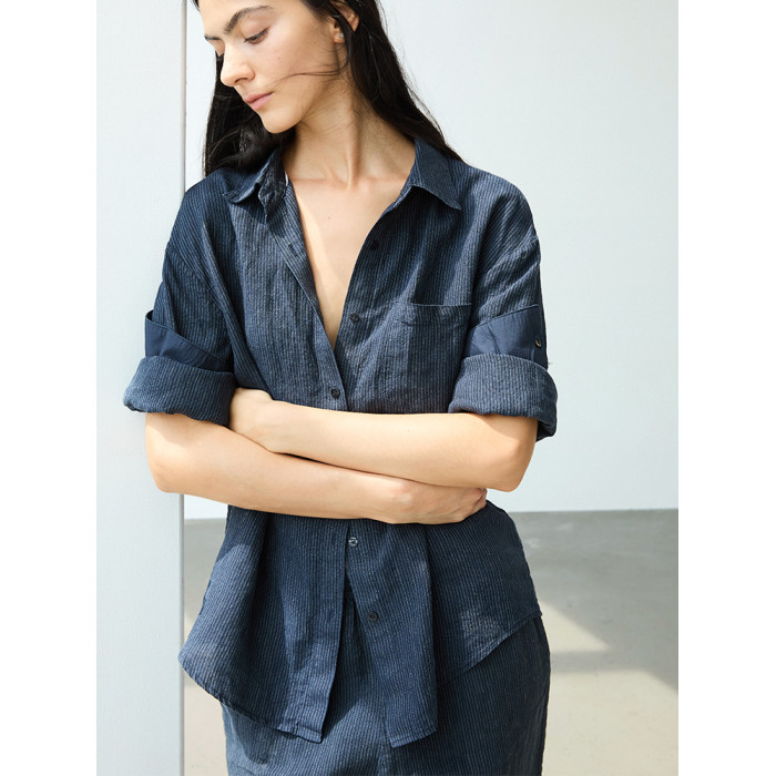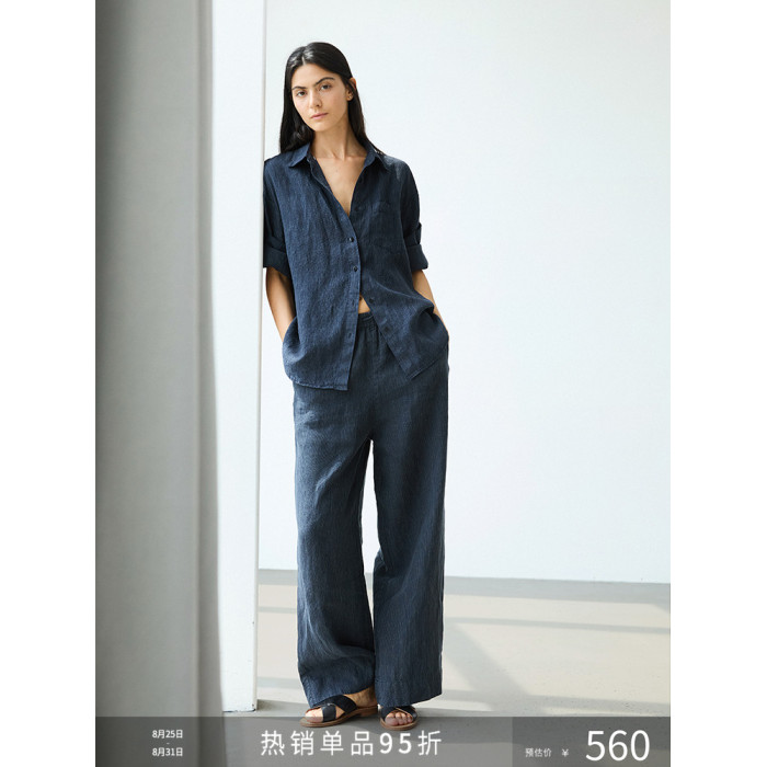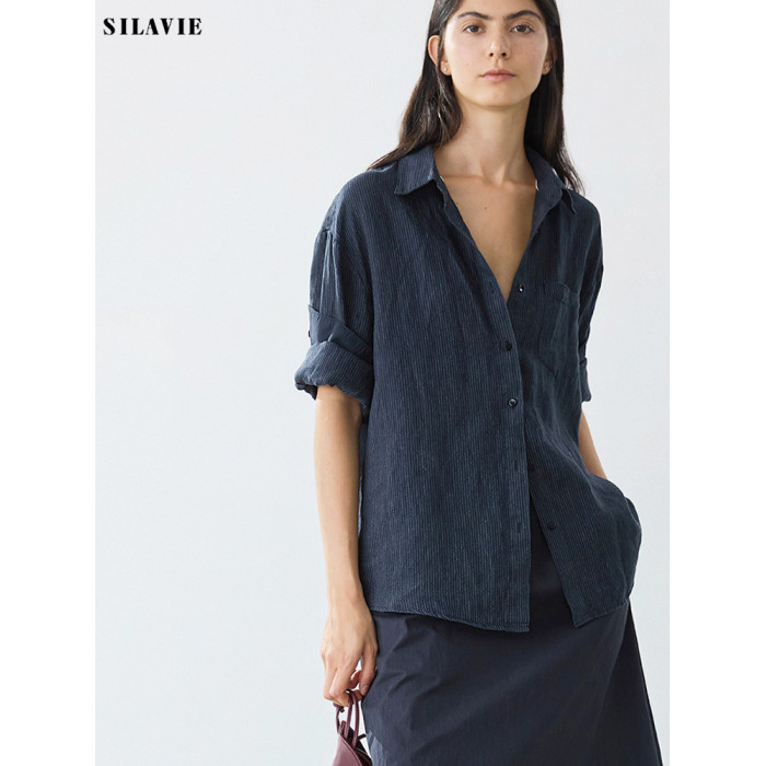 SILAVIE時髦老錢寬松廓形苧麻色織時尚設計感條紋襯衫褲子套裝女