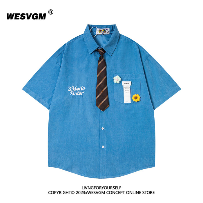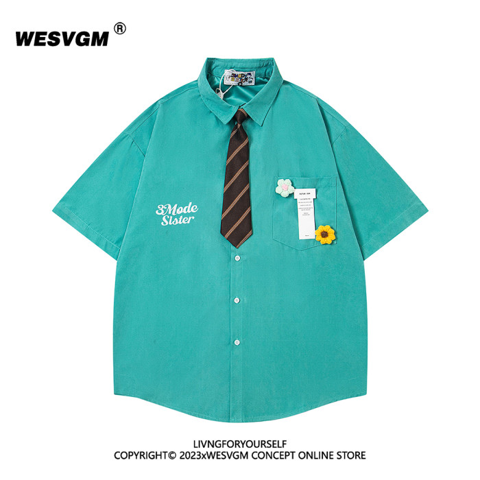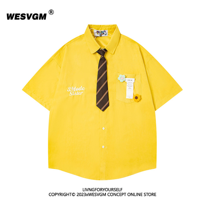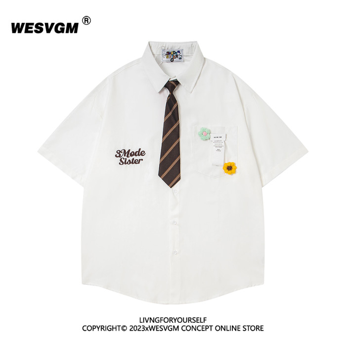 WESVGM設計感小衆別針花朵領帶短袖襯衫男女夏季港風寬松半袖上衣