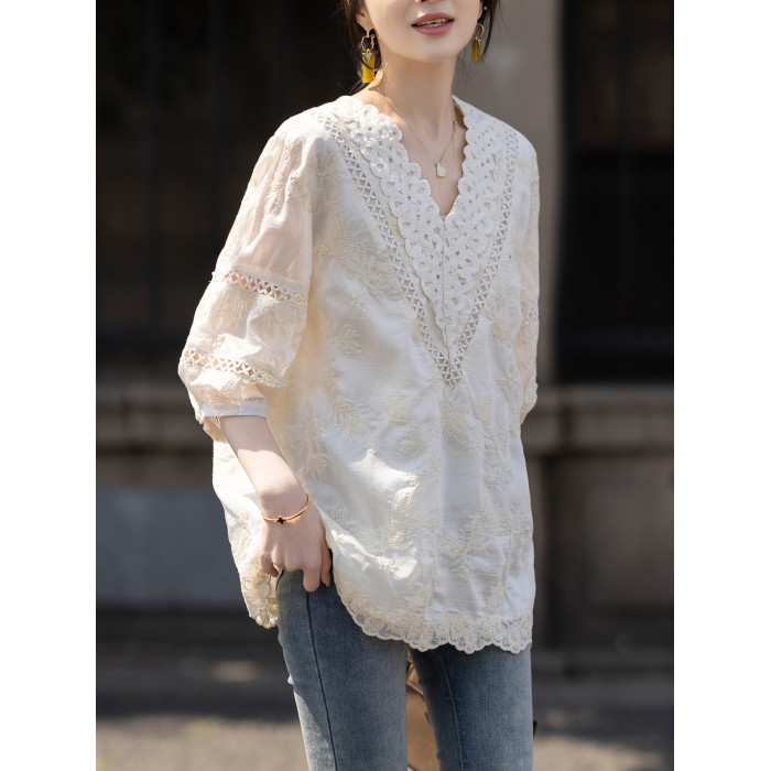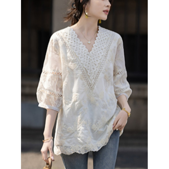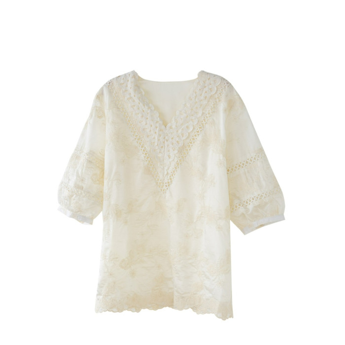 九月陌墨設計感重工拼接V領鏤空短袖襯衫女夏季氣質百搭小衫上衣