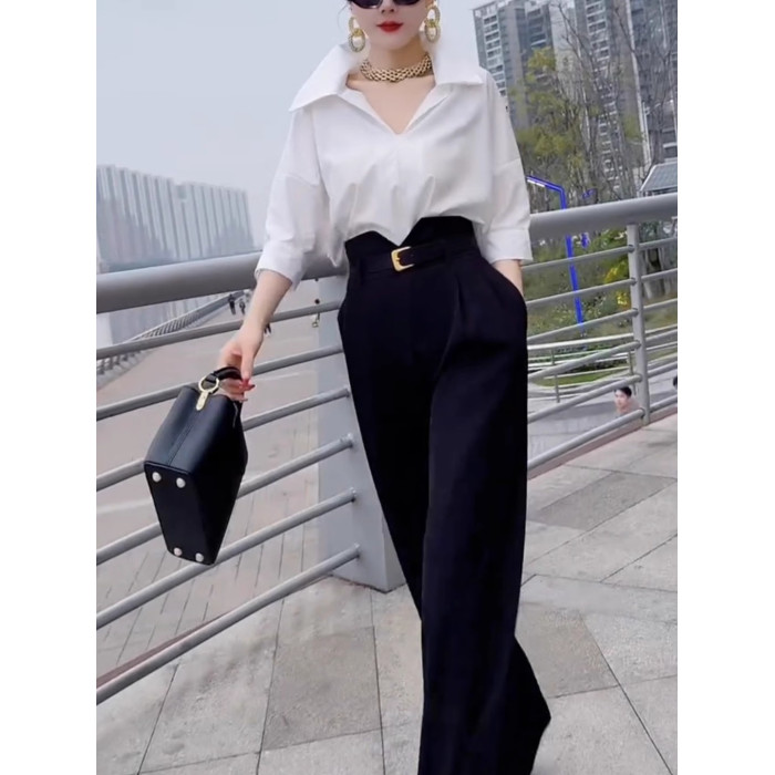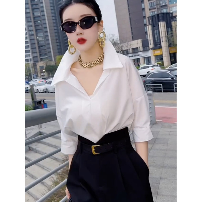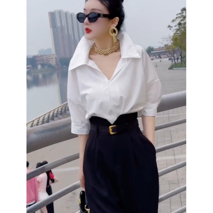 歐洲站春夏新款氣場強大乾練氣質女裝輕奢高級感POLO白色百搭襯衫