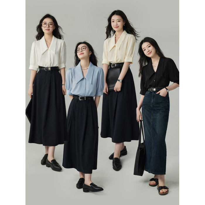 JACOOBS婭可家黑色襯衫女夏設計感小衆法式休閒氣質尖領短袖上衣
