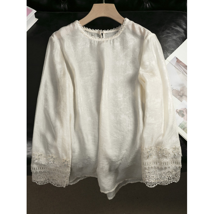 新中式國風刺綉歐根紗長袖襯衫女2025夏季高級感氣質別致內搭上衣