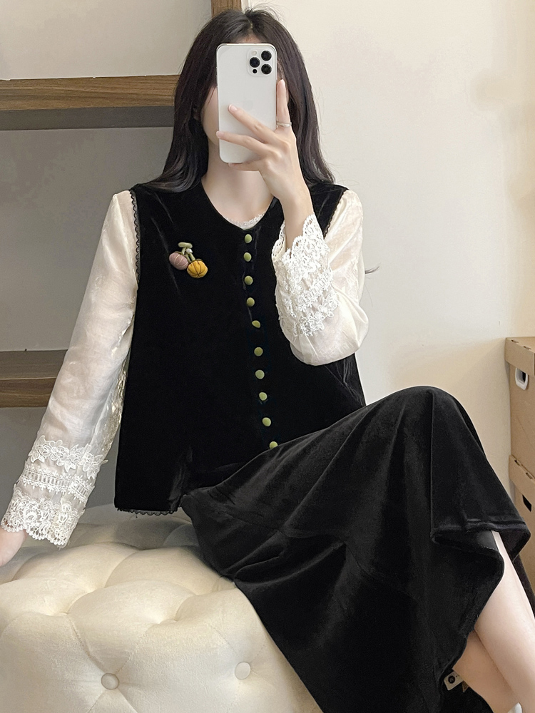 黑色南瓜馬甲+黑色絲羢裙