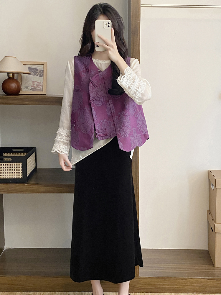 紫色馬甲+黑色絲羢裙