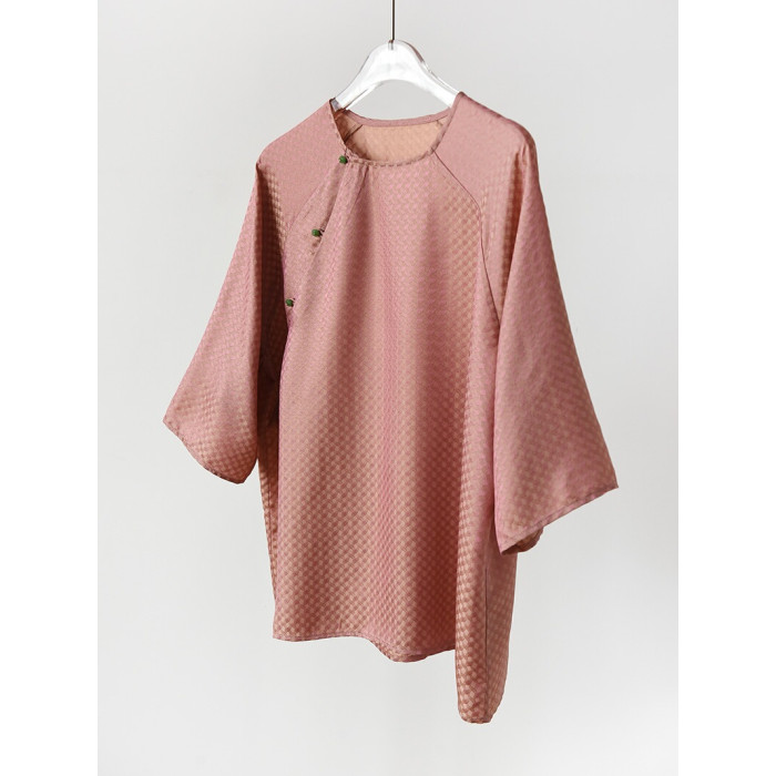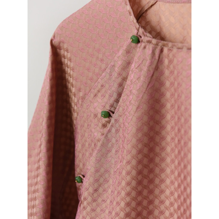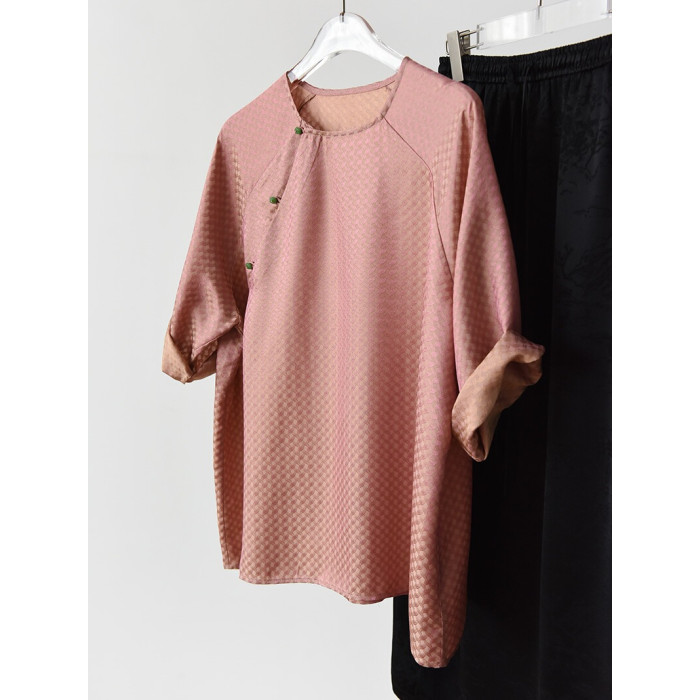 富貴閒人裝 新中式真絲提花斜門襟花朵玉石中袖襯衫 古風氣質款