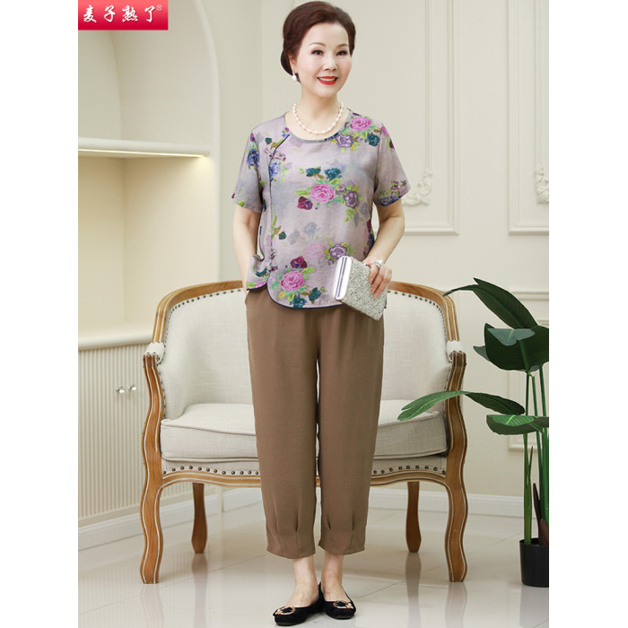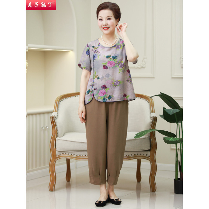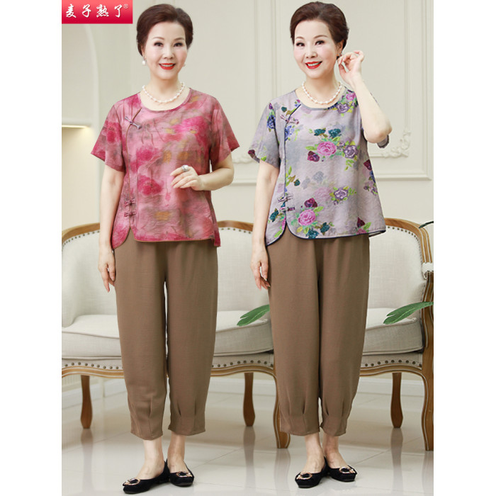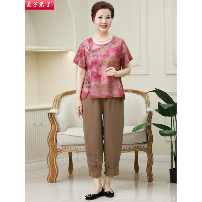 2025夏季新款國風綿綢媽媽兩件套裝短袖洋氣奶奶中老年人女裝T恤