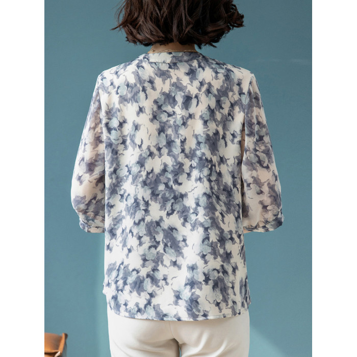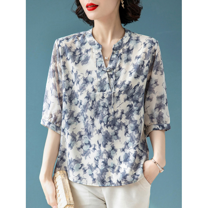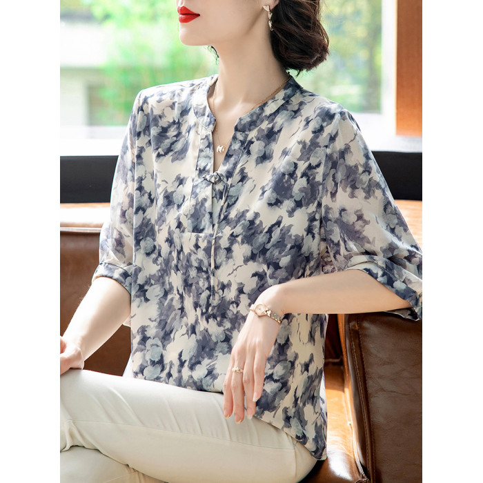 2025新款媽媽夏裝雪紡衫上衣中老年女裝洋氣碎花襯衫中袖T恤小衫