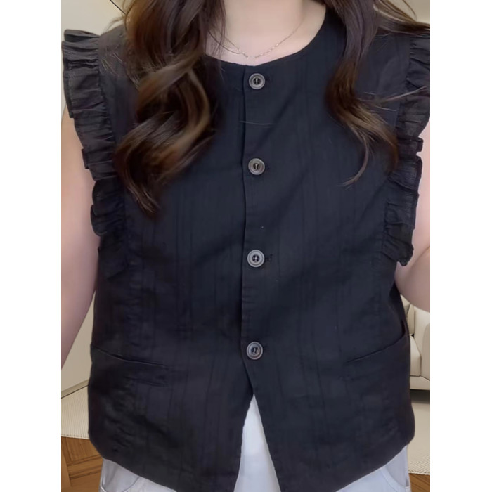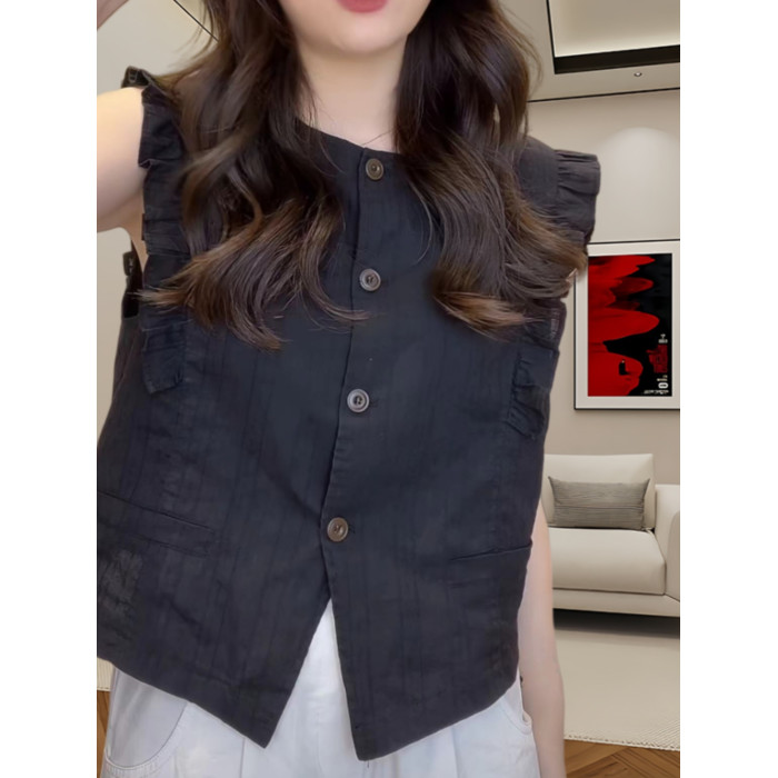 法式無袖襯衫女夏季新款圓領荷葉邊設計薄款小衫時尚氣質百搭上衣
