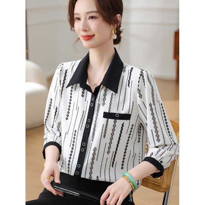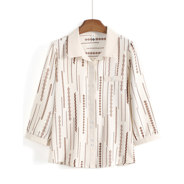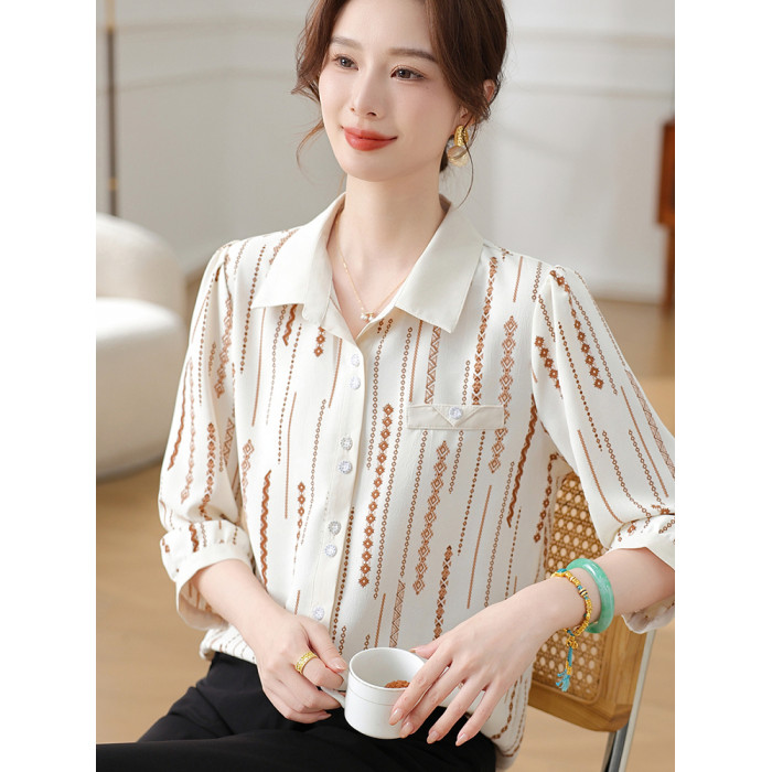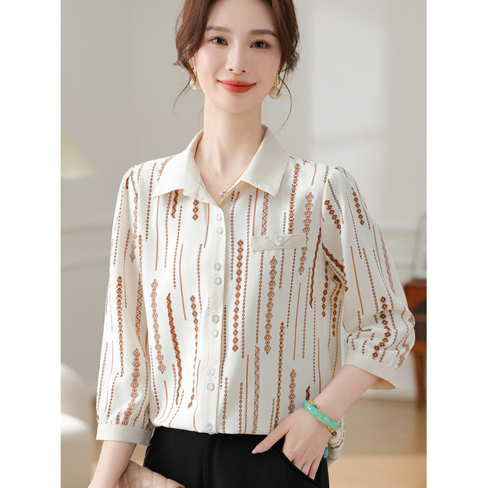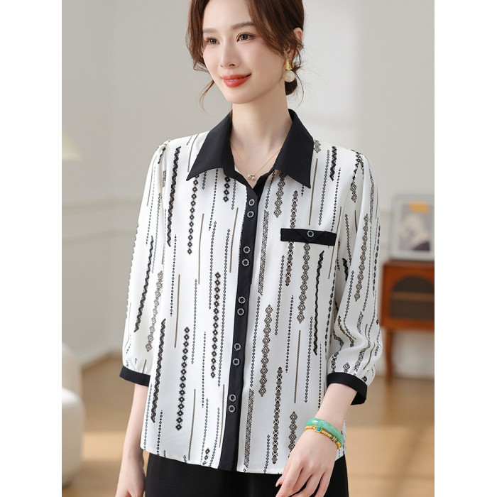 時尚媽媽翻領印花襯衫2025新款春夏中老年女薄上衣雪紡七分袖襯衣