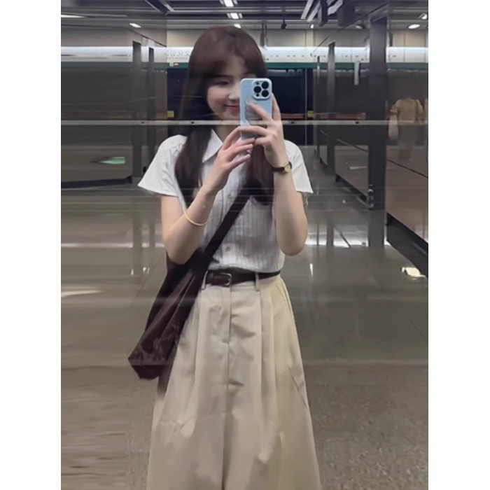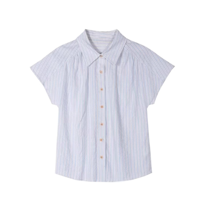法式高級感藍色條紋襯衫女夏季設計感小衆復古寬松polo衫短袖上衣