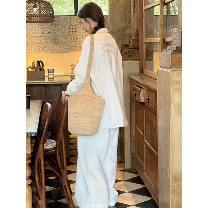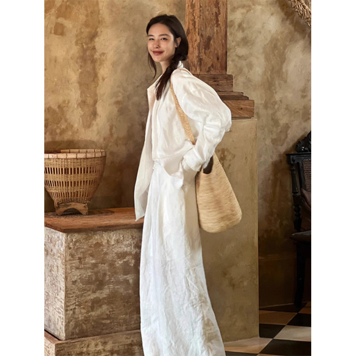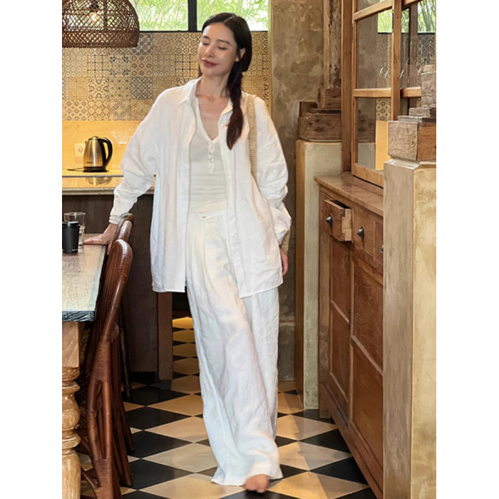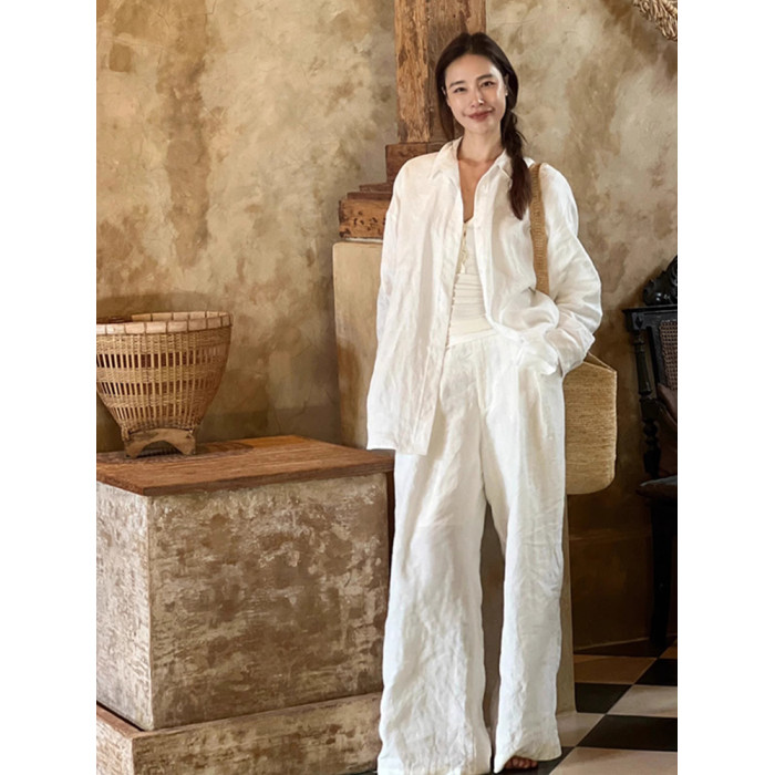 高級感白色棉麻襯衫套裝女春夏休閒百搭薄款防曬亞麻襯衣長褲兩件