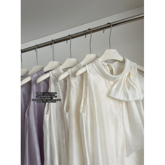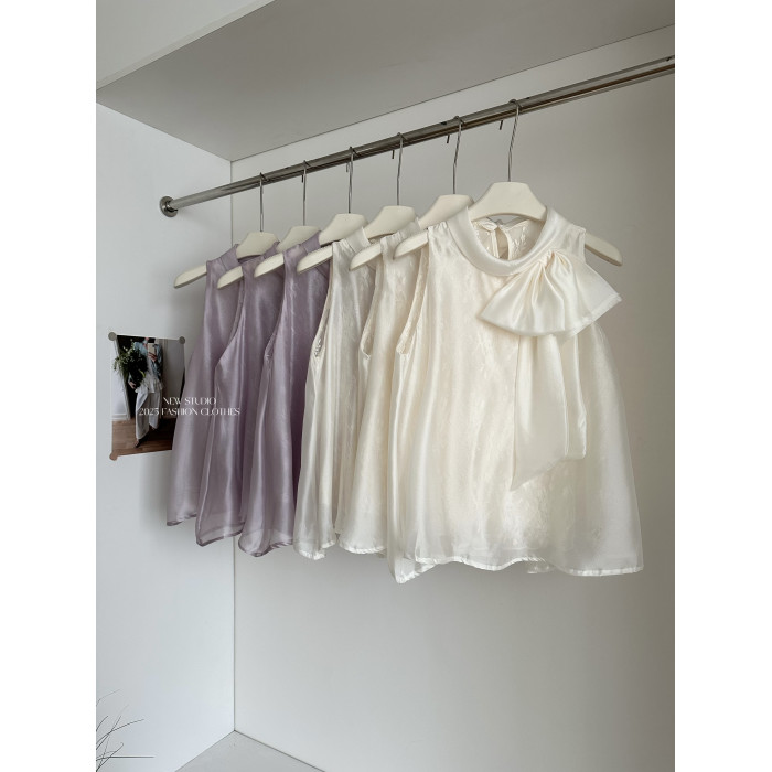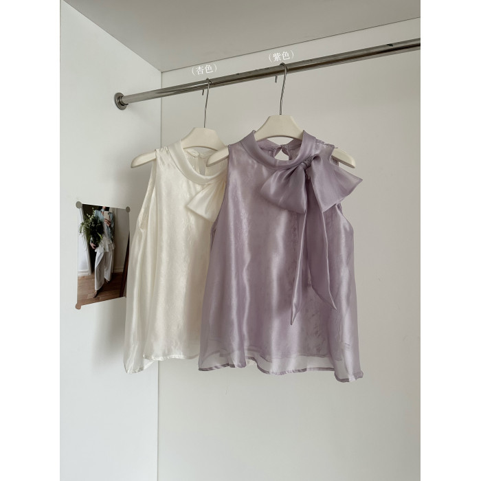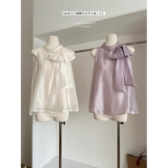 法式蝴蝶結高級感減齡背心上衣夏季無袖氣質寬松露肩天絲防曬襯衫
