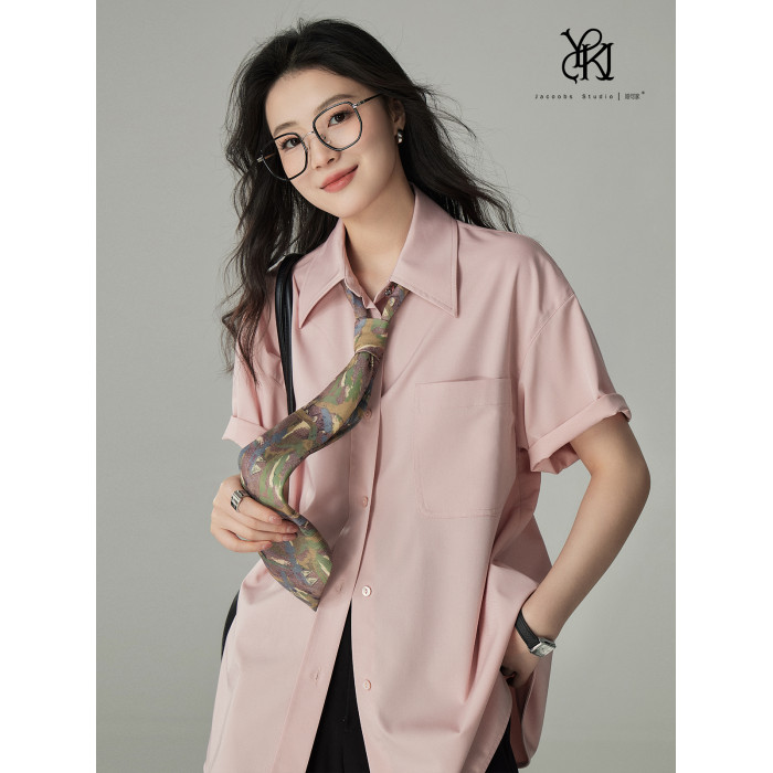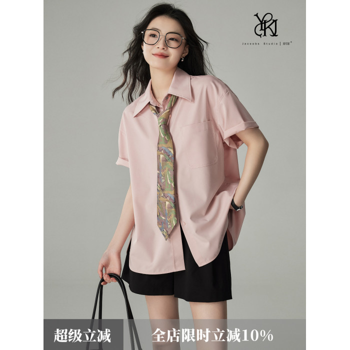 婭可家多巴胺穿搭粉色休閒短袖襯衫女夏季寬松顯瘦不易皺百搭襯衣